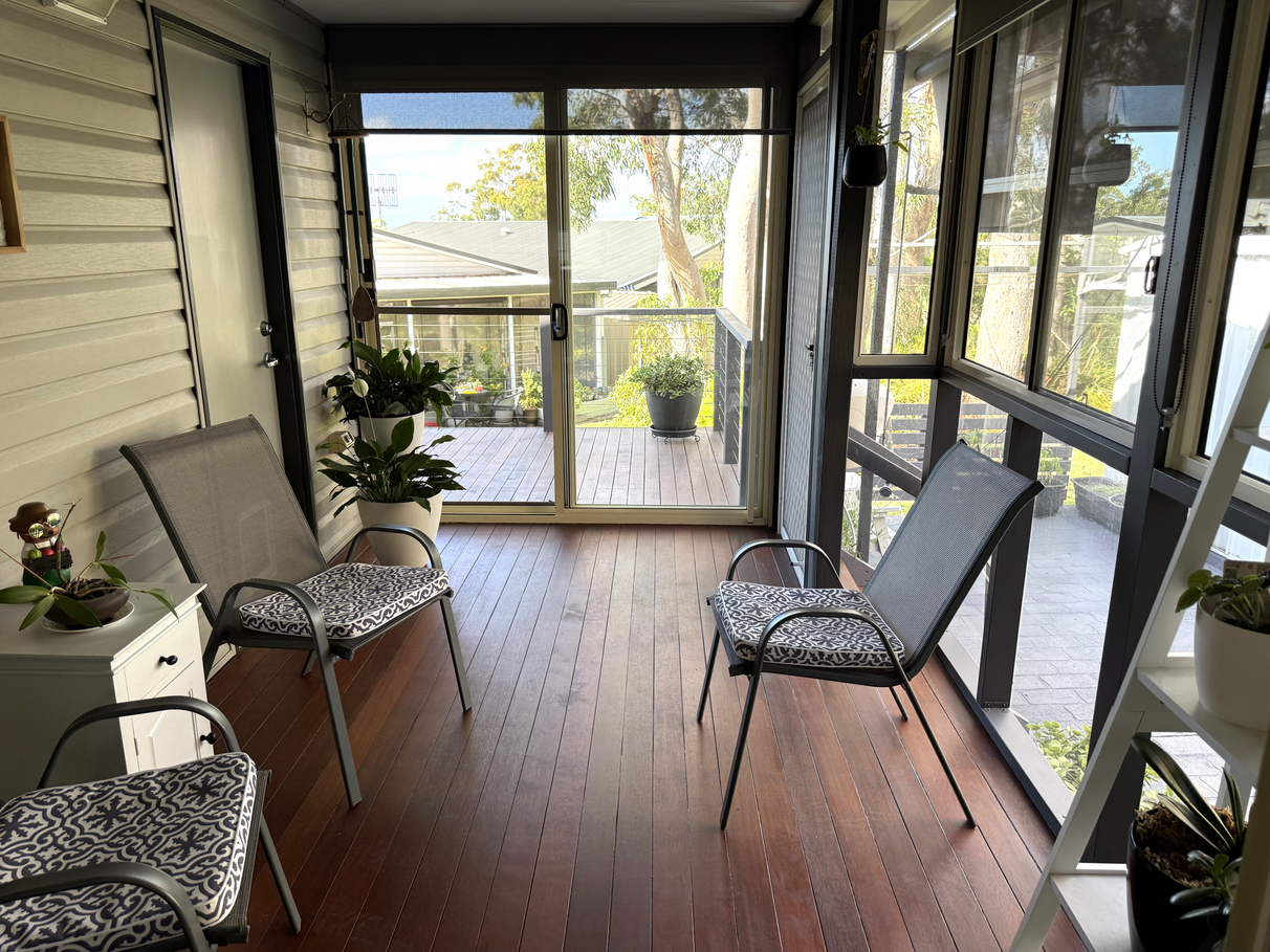 Enjoy your morning coffee or afternoon unwind in the enclosed sunroom, offering extra living space in every season. At the rear of the site, a deck provides the perfect outdoor setting for entertaining or simply enjoying the peaceful surroundings.