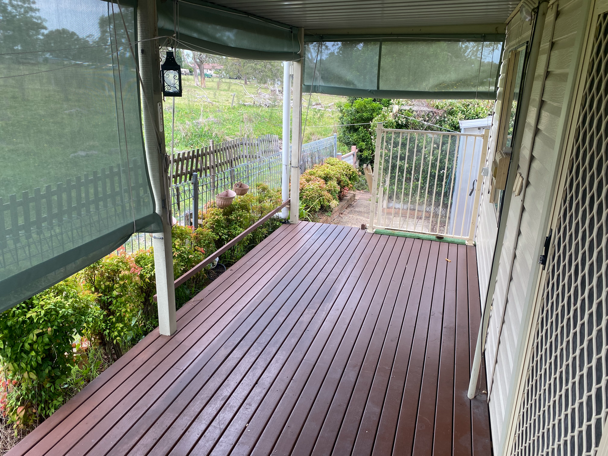 Cosy 2 bedroom home on a perimeter site featuring a front enclosed veranda and a large back deck. The home also includes Kitchen, laundry a modern bathroom, air conditioning, garden shed and an additional storage shed.
