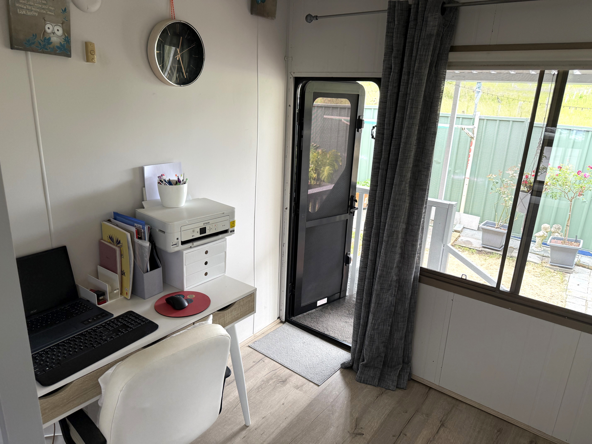 The home features a one-bedroom plus study, along with a light-filled sunroom perfect for relaxing with a morning coffee or enjoying the peaceful outlook. The newly renovated kitchen is fresh and functional, complemented by new flooring throughout for a modern finish. Comfort is assured with two air conditioners, one in the living area and one in the bedroom.