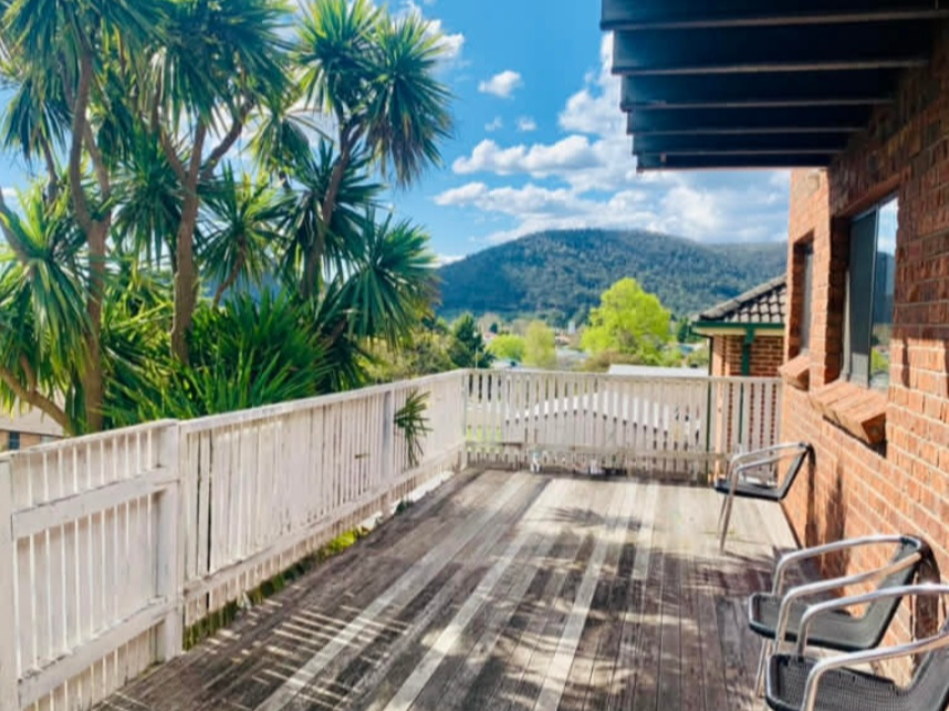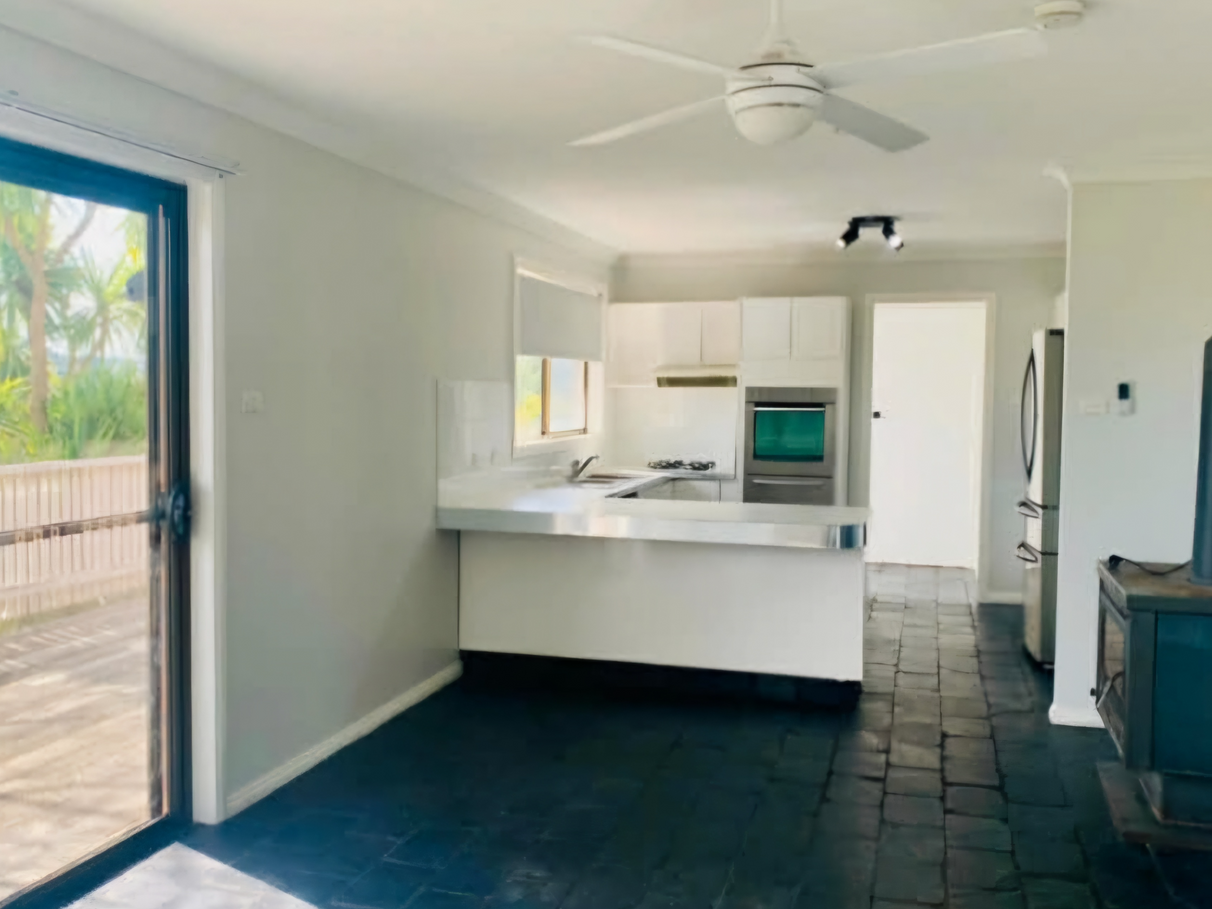 Bright, open kitchen with sliding doors leading to a wrap-around timber deck