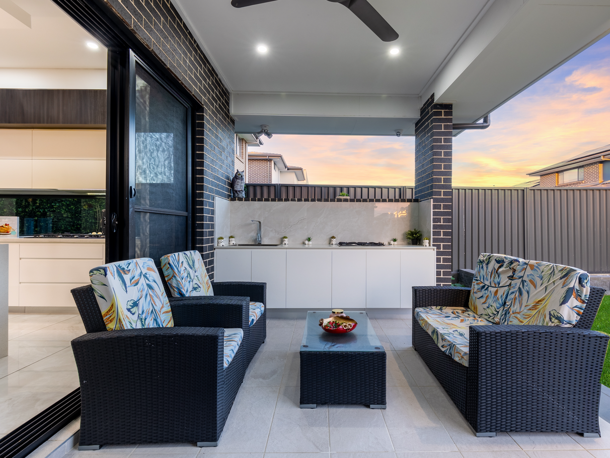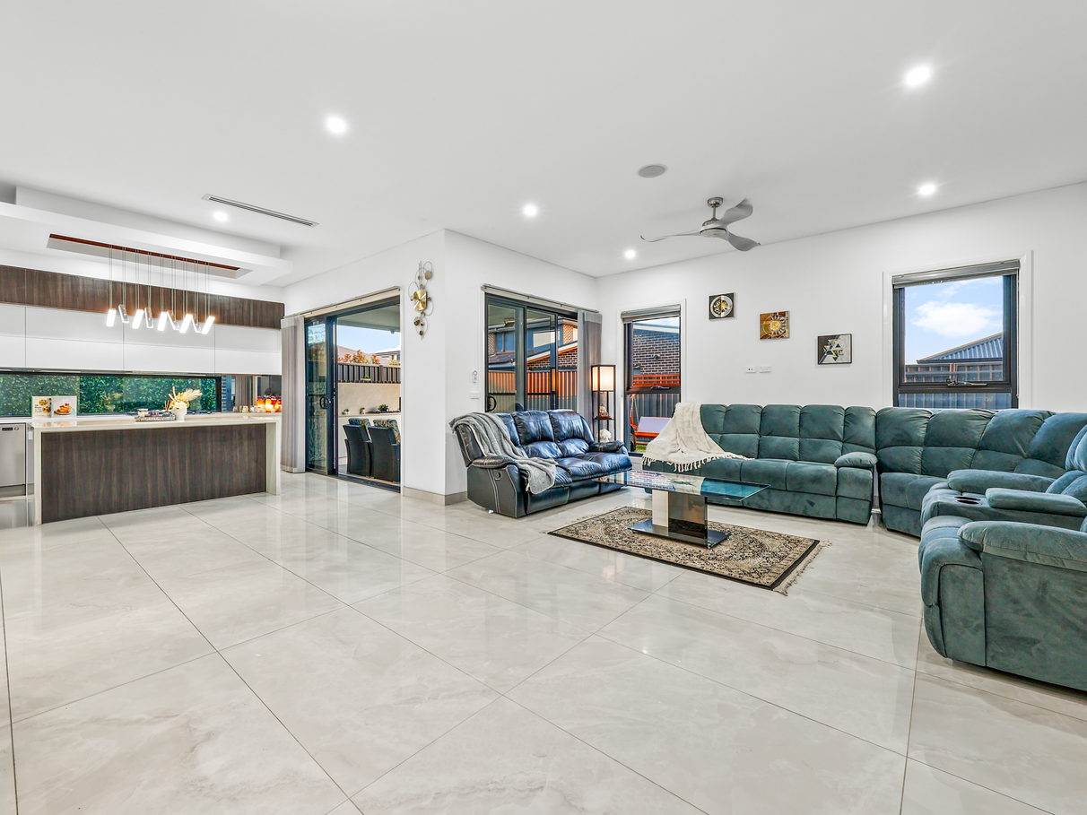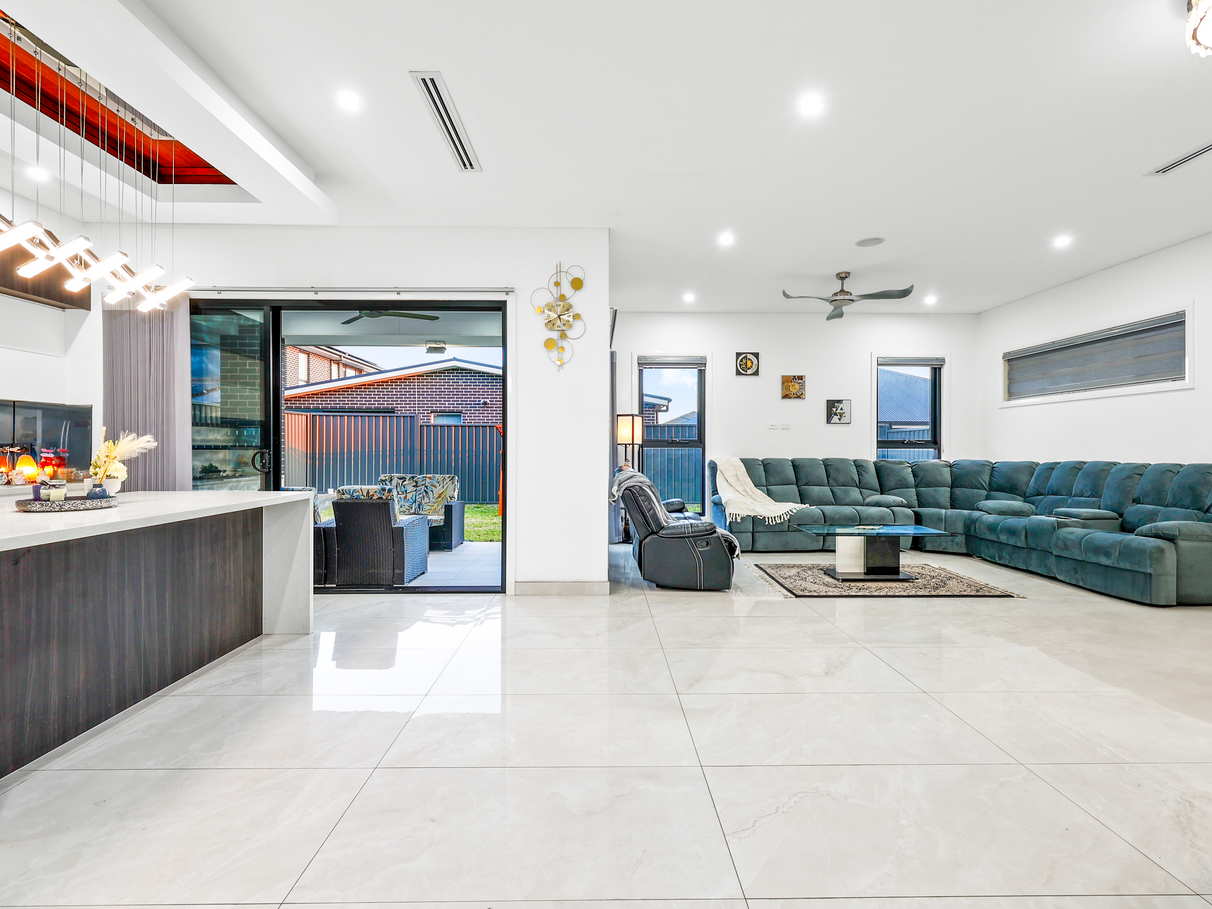 Spacious open-plan living area with two large sliding doors opening to the alfresco