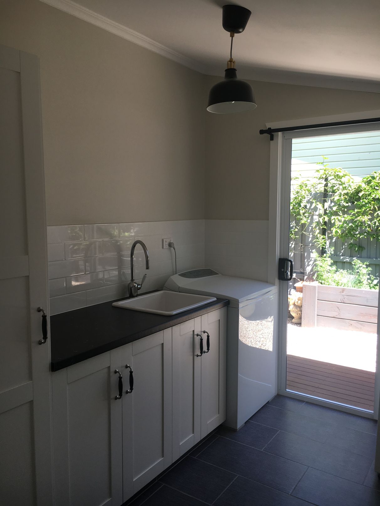 new Laundry with built in soft close cupboard’s, drop in china basin external glass sliding door leading out onto timber deck to cloths lines, with adjoining new inside toilet.