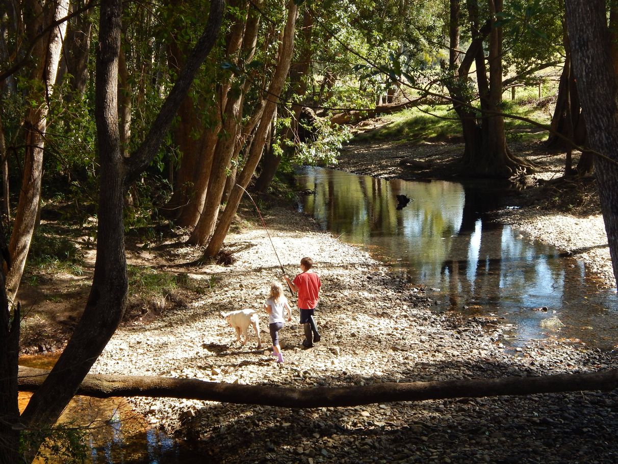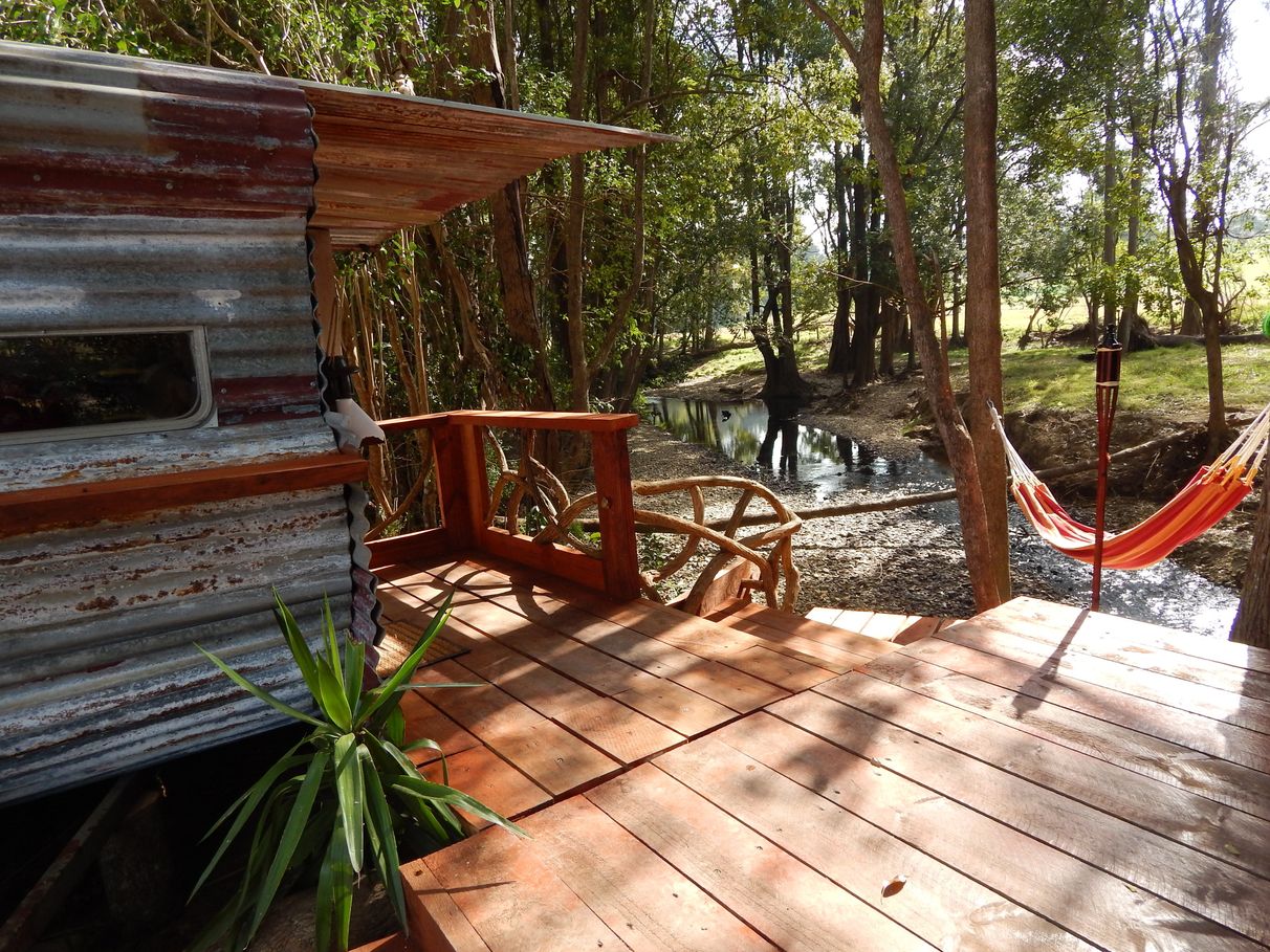 Down by the Creek you can take a dip or just relax in a hammock and watch the day go by listening to all the wildlife that surrounds you. There is a fire pit, rustic cabin and deck area by the creek which is the place to be to relax and unwind and have a few coldies or vinos. The cabin itself has a queen size bed and opens out onto the deck area and looks down to the creek. There are various decks and seating available.