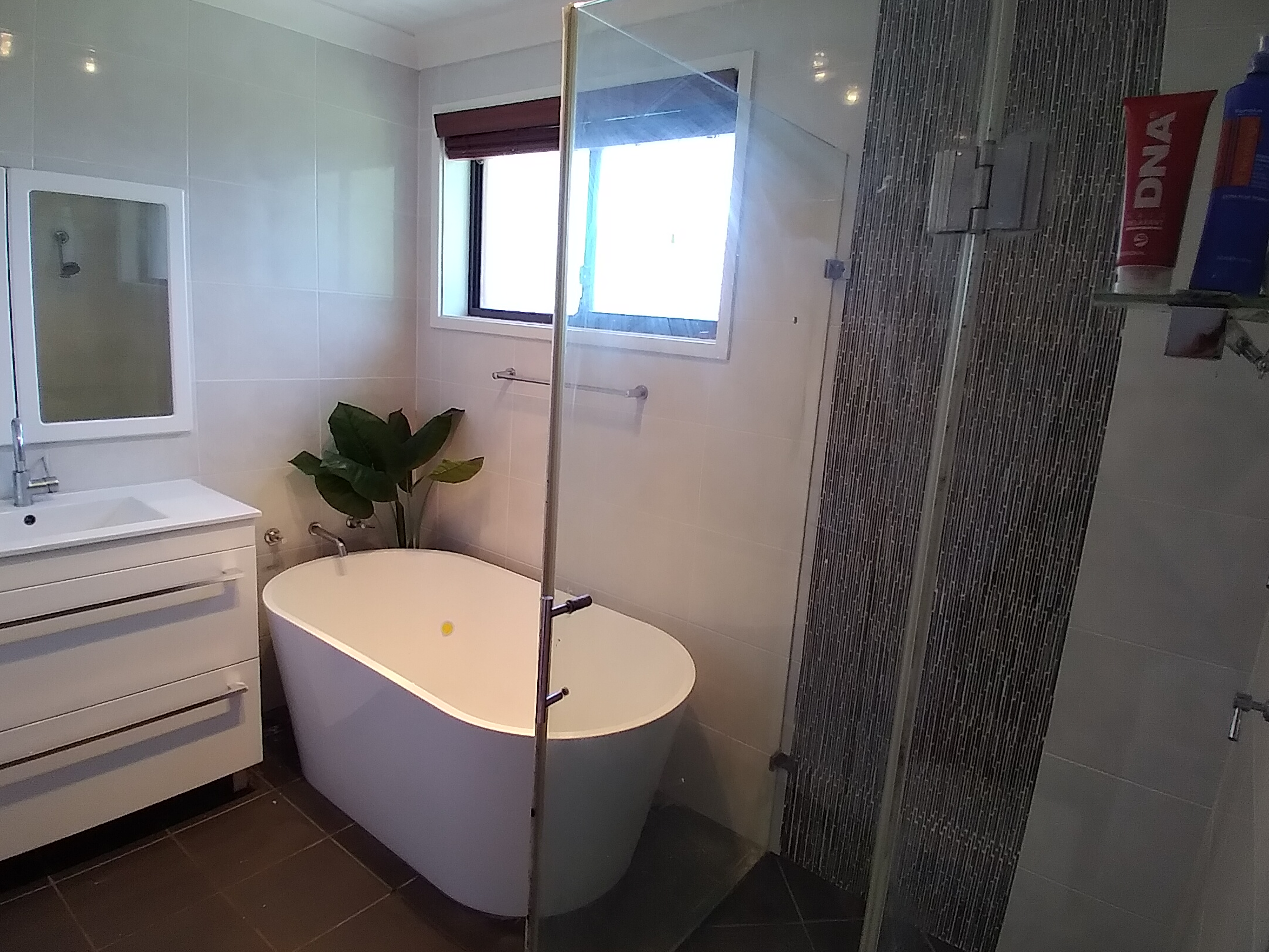 The bathroom is fully renovated with a modern free standing bath, floor to ceiling tiles and floating vanity, second toilet in laundry.