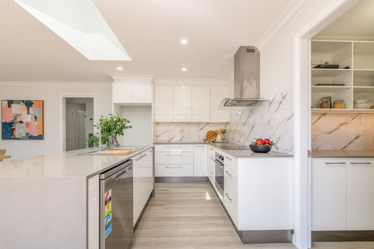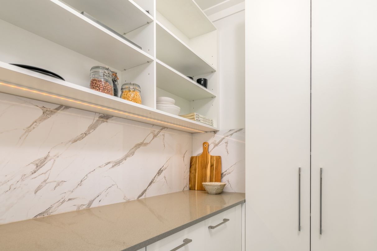 Impressive modern kitchen showcasing stone benchtops and Fisher and Paykel appliances and a walk-in pantry with ample storage