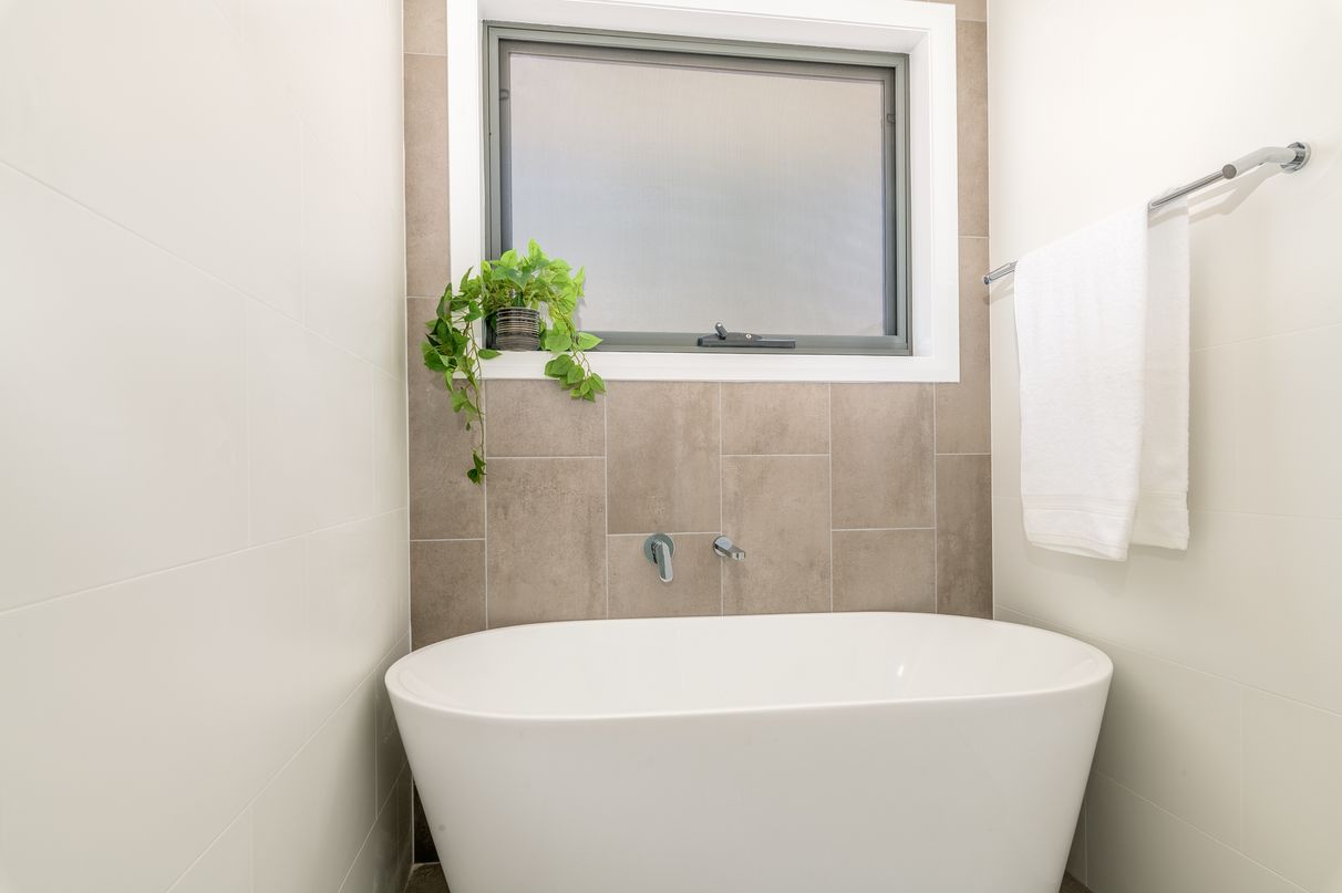 Light-filled central bathroom with designer tiles and large freestanding bath