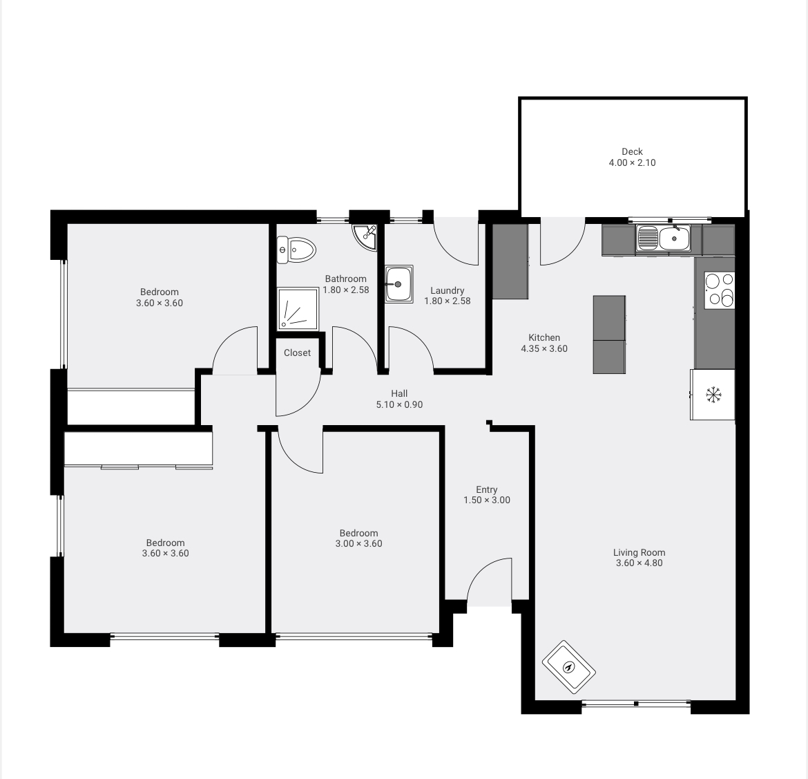Bedroom 1 (3.6m x 3m) includes a full wall of built-in robes