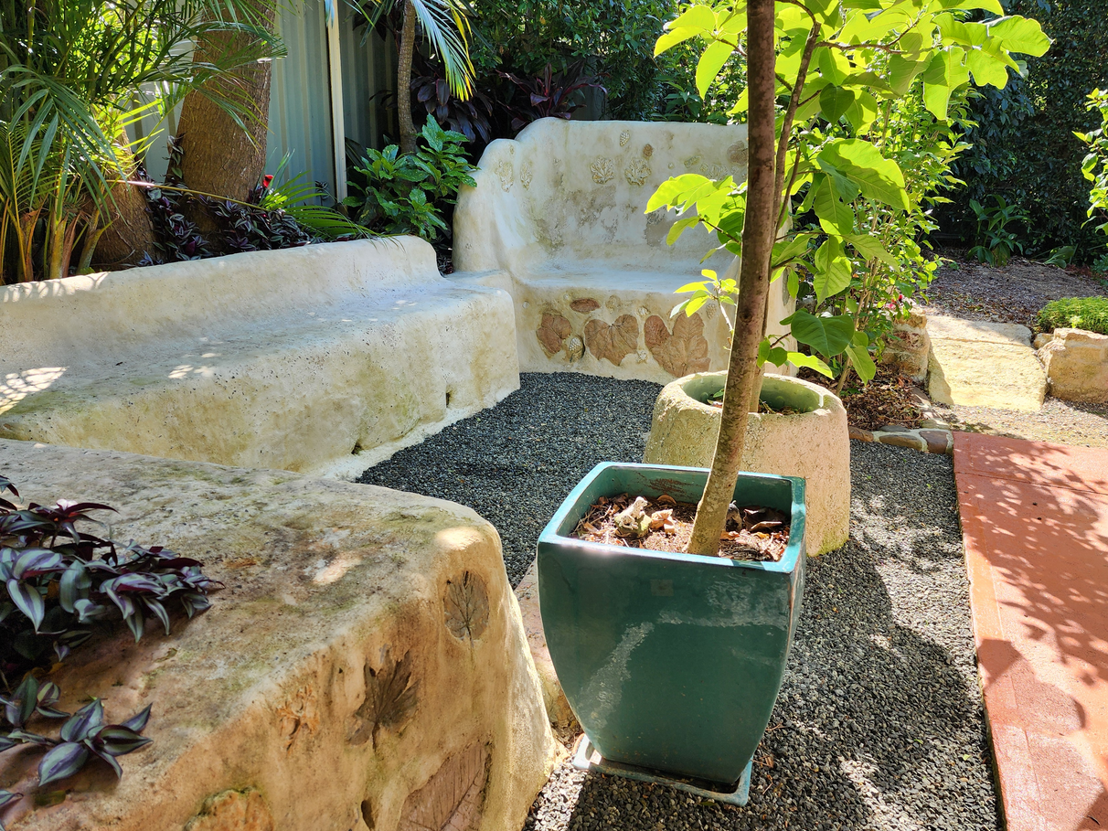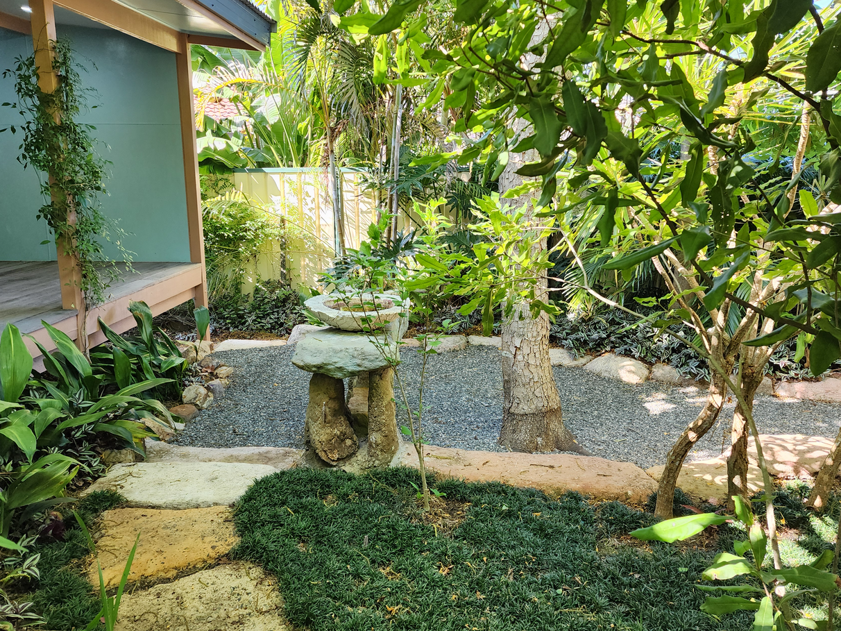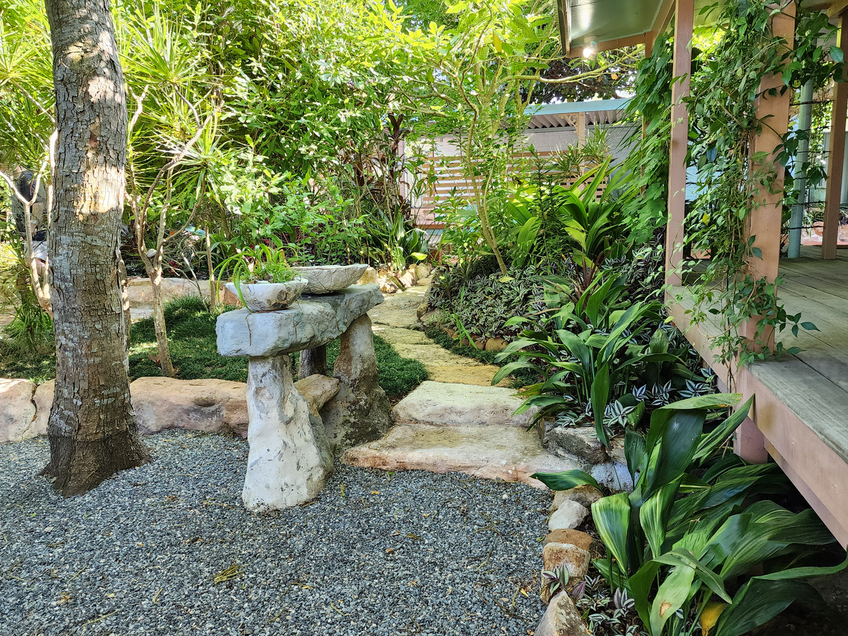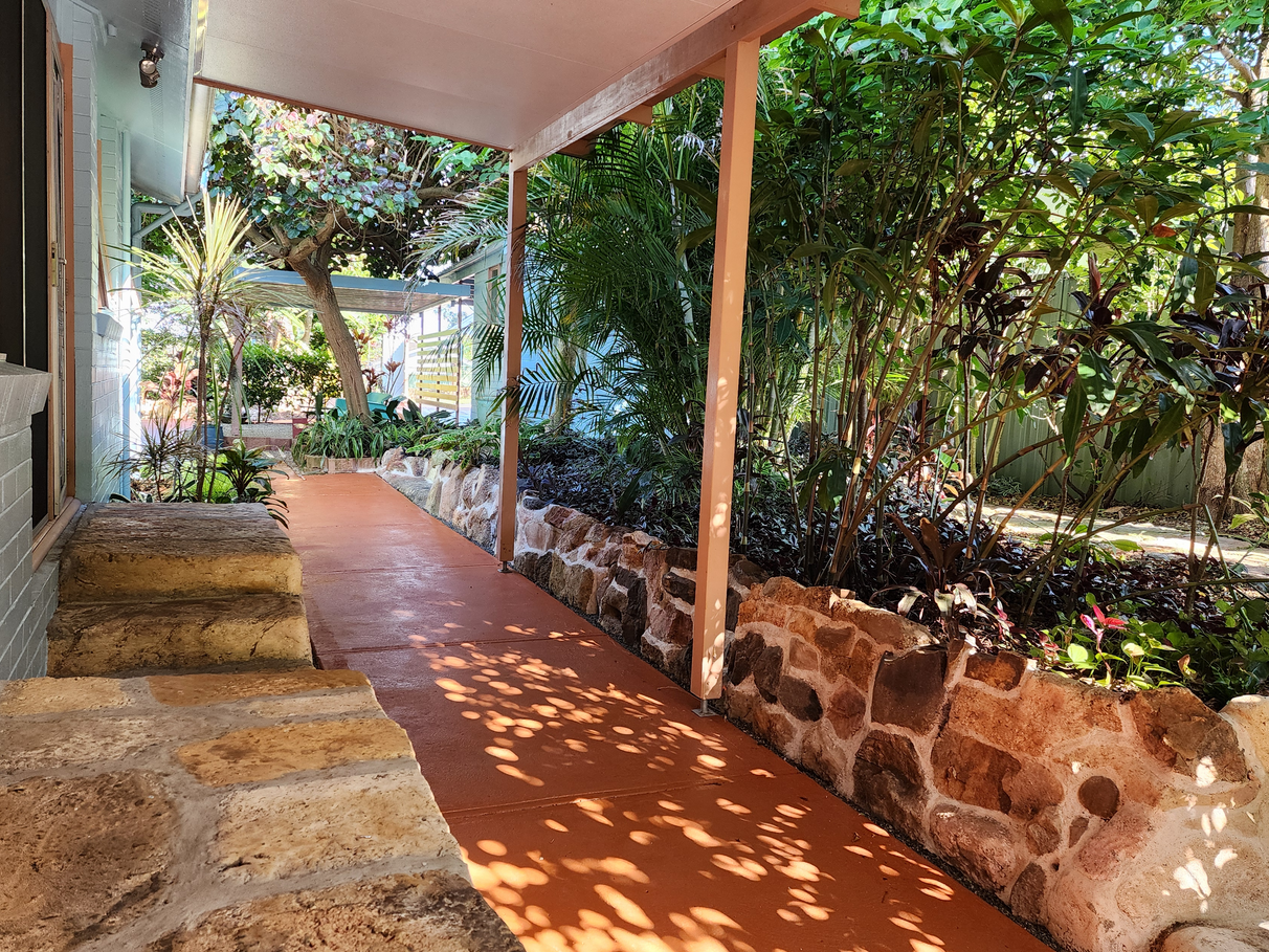 The fully landscaped garden's lush green textures are complimented by hibiscus, camelias and magnolias. There are numerous places to sit and relax under established shade trees.