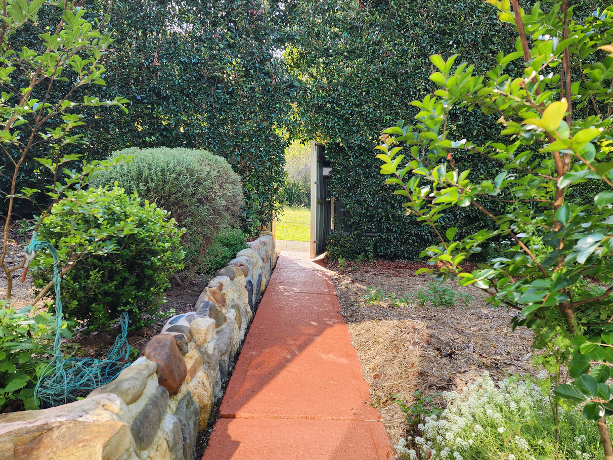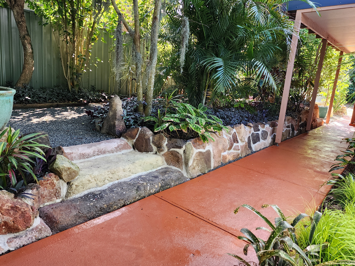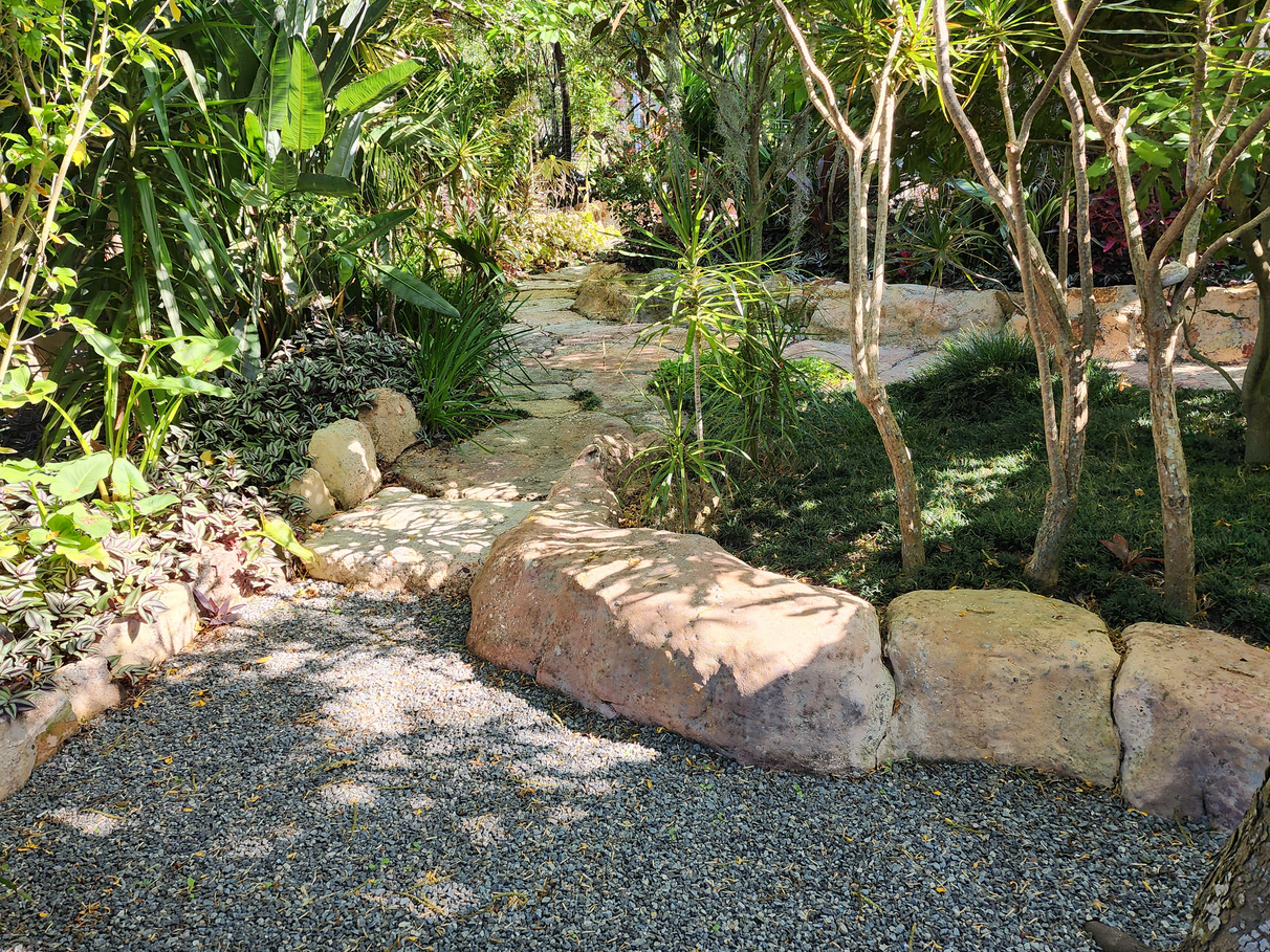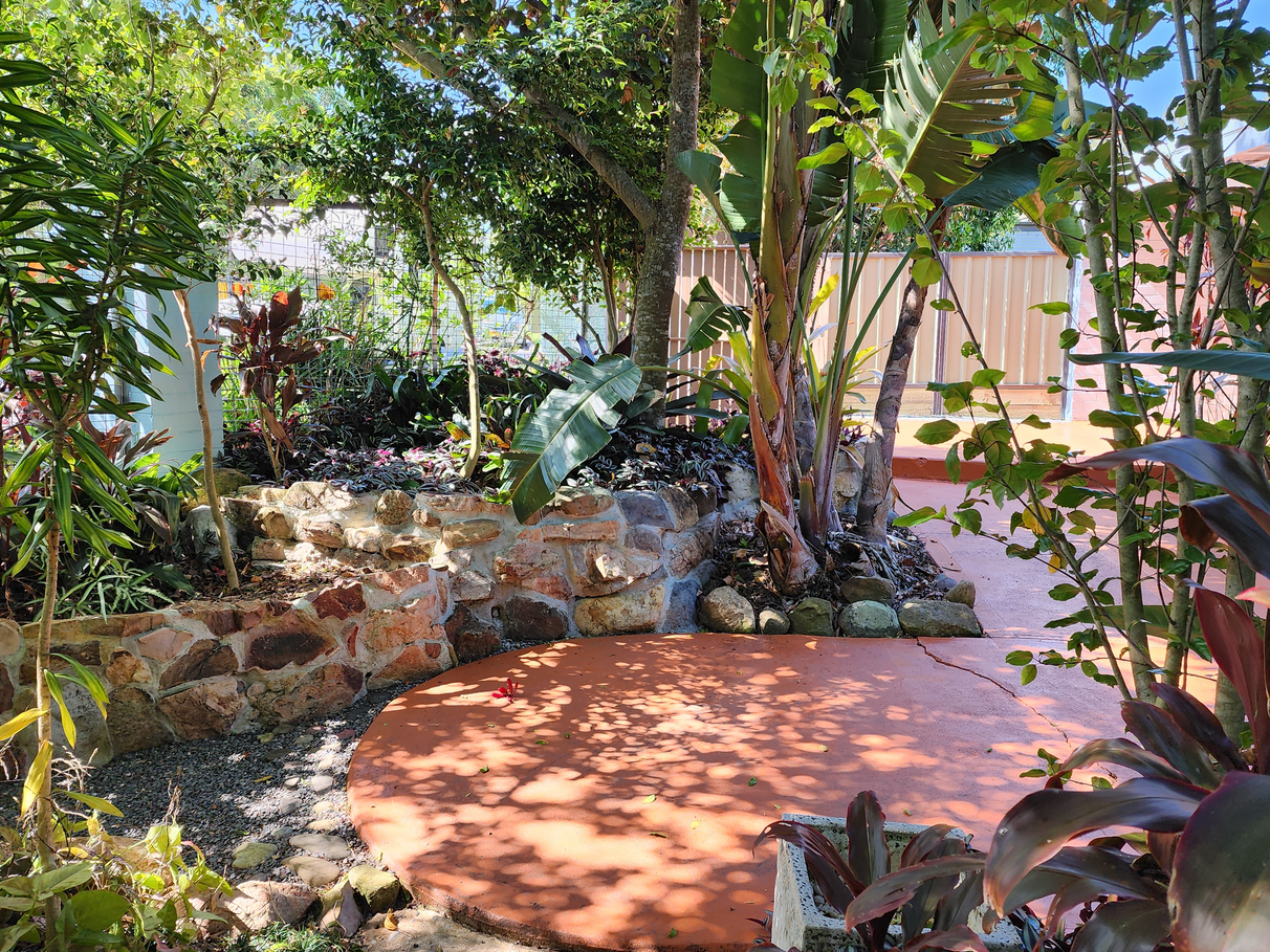 The fully landscaped garden's lush green textures are complimented by hibiscus, camelias and magnolias. There are numerous places to sit and relax under established shade trees.