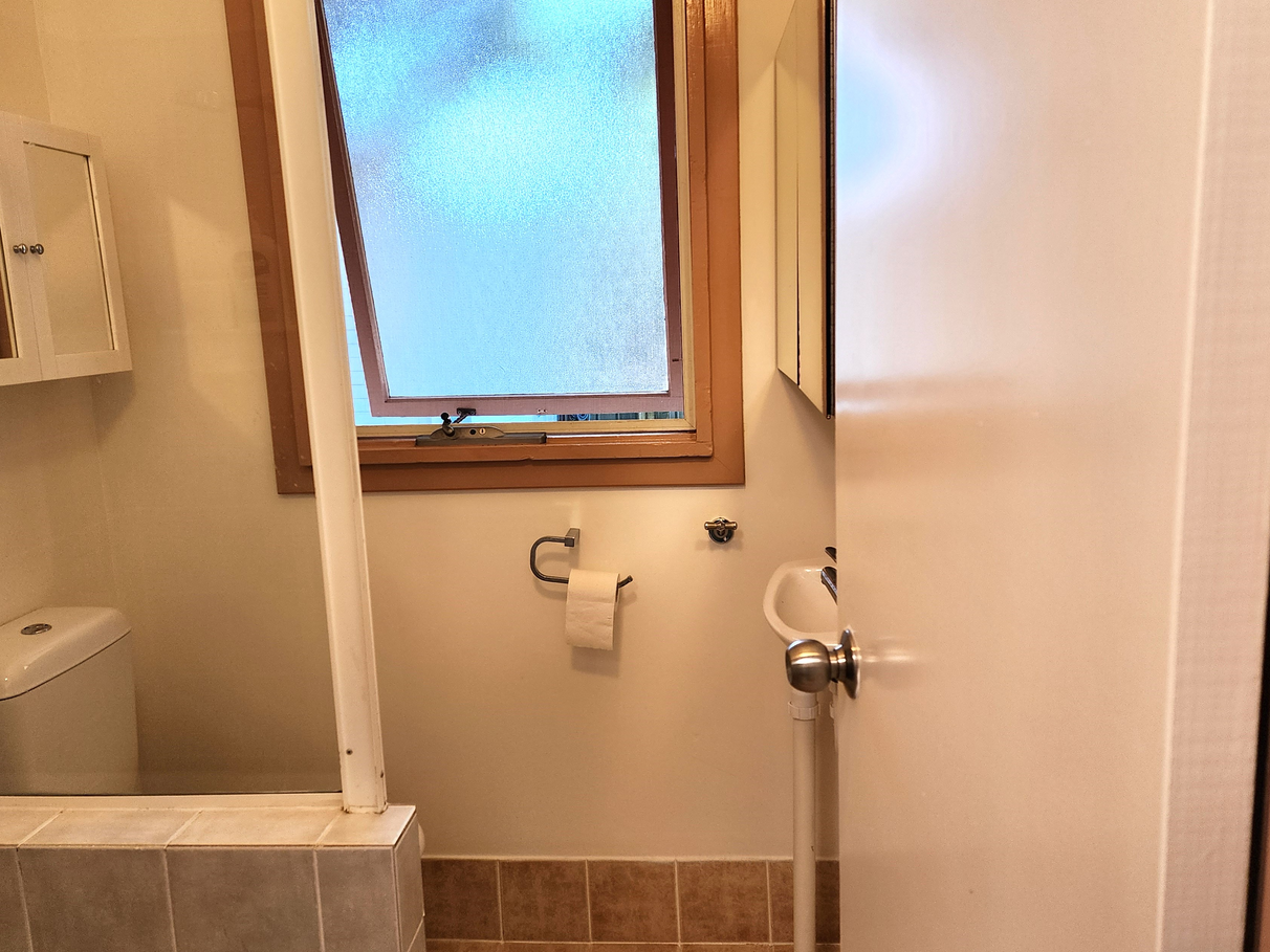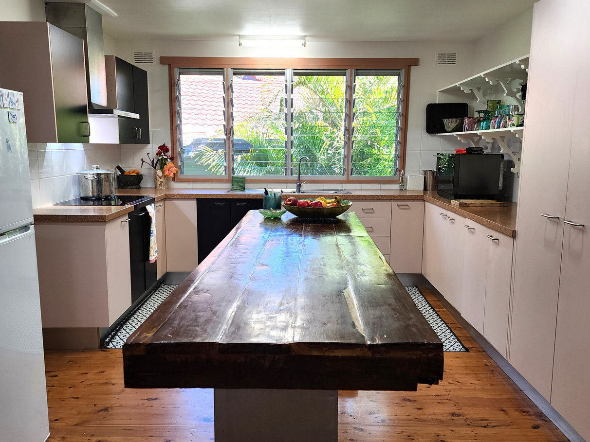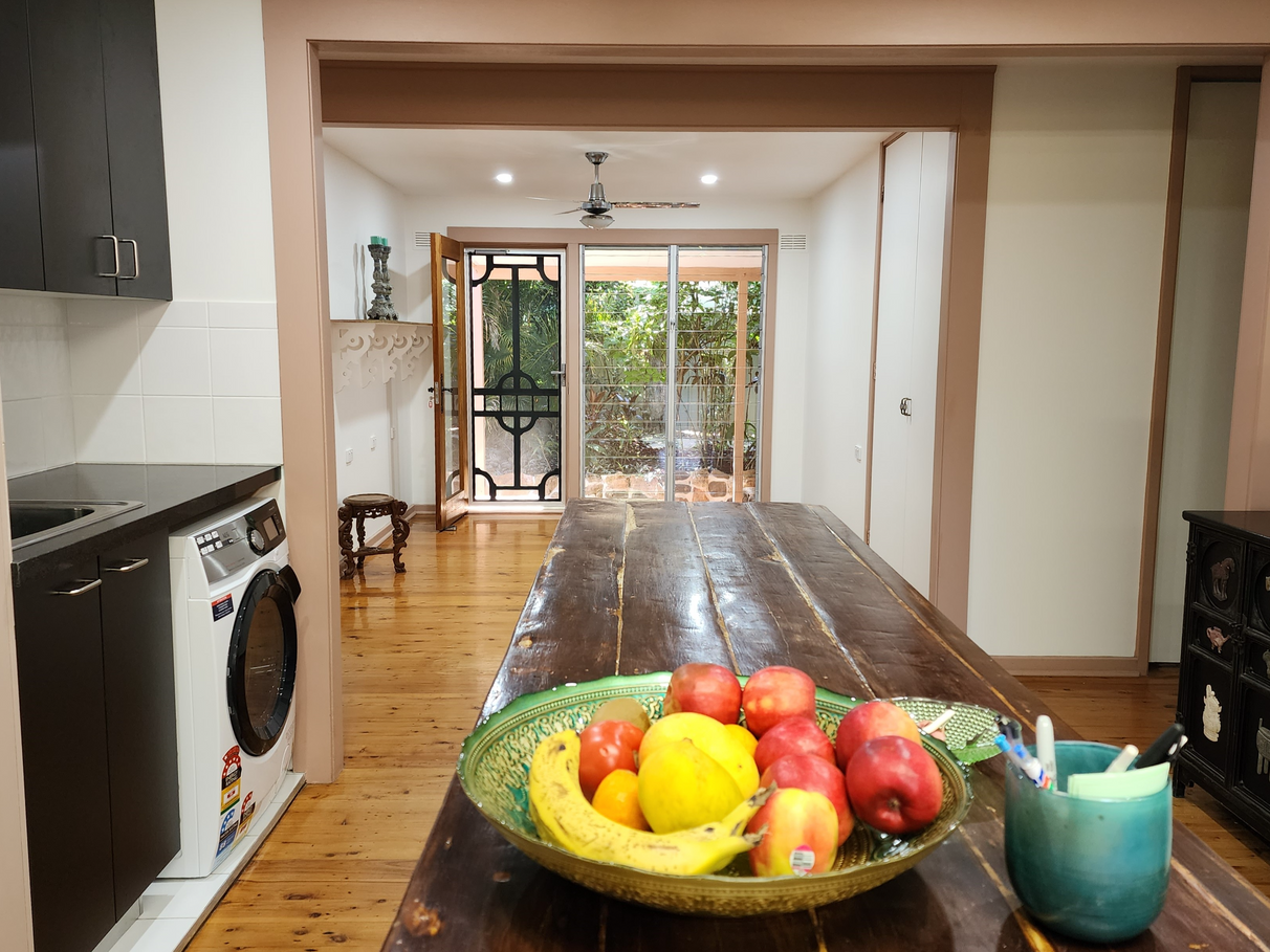 • The Spacious Kitchen opens onto a living/dining room with direct access to the garden. The Kitchen is in good working order but is old and ready for a new owner to update in their own style. It uses energy saving cookers – a 4 burner induction hob and a countertop 4-in-1 cooker which is a convection oven, grill, steamer, and microwave. It has a large second sink for making home brew while watching TV sport and washing vegies from the garden. Under the sink is a European style laundry. Dishwasher plumbing and mains gas are installed but not currently used.