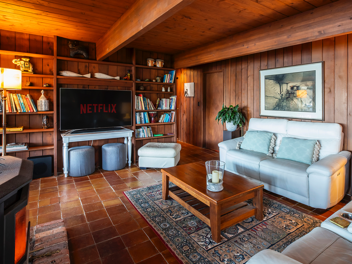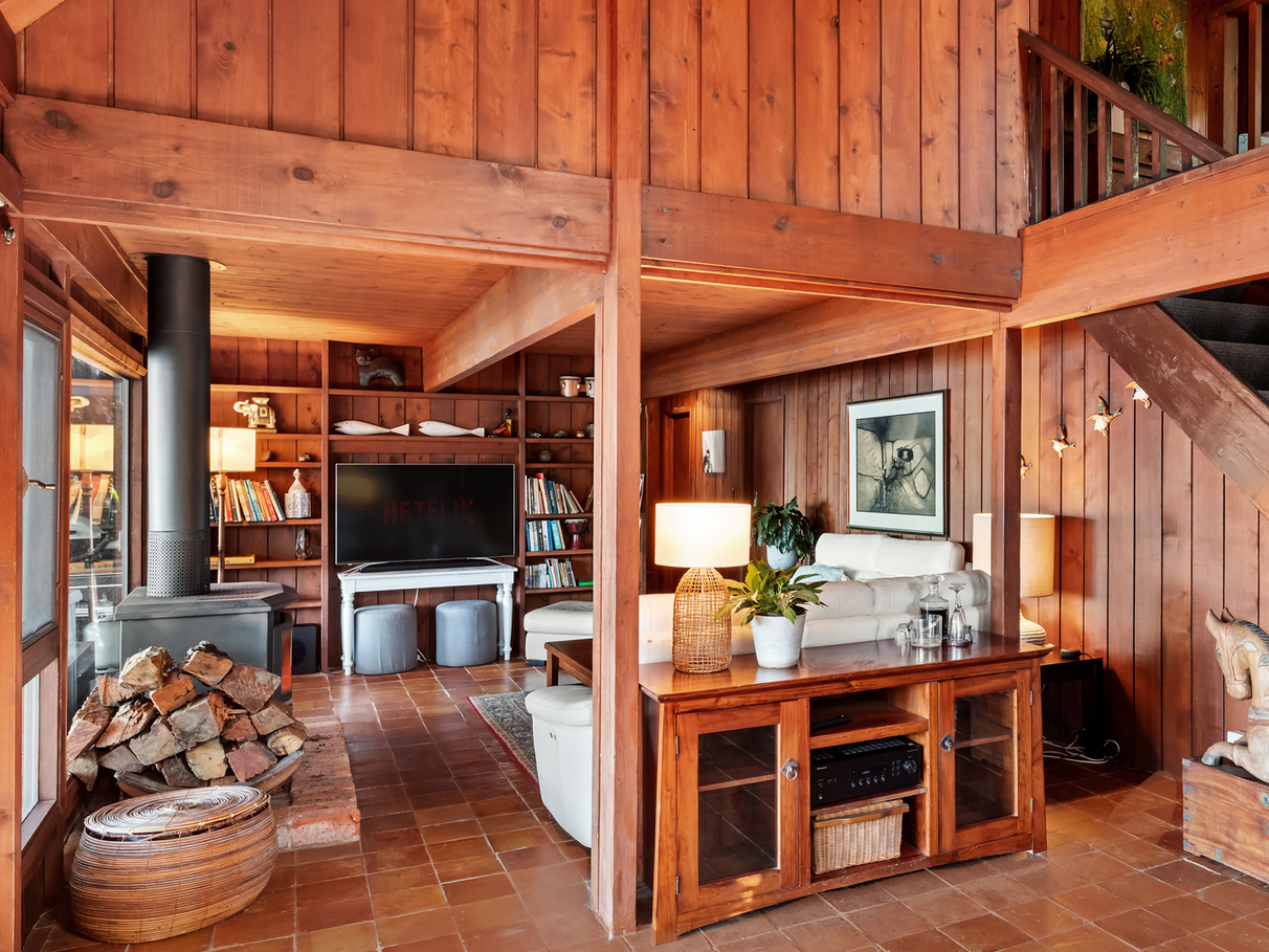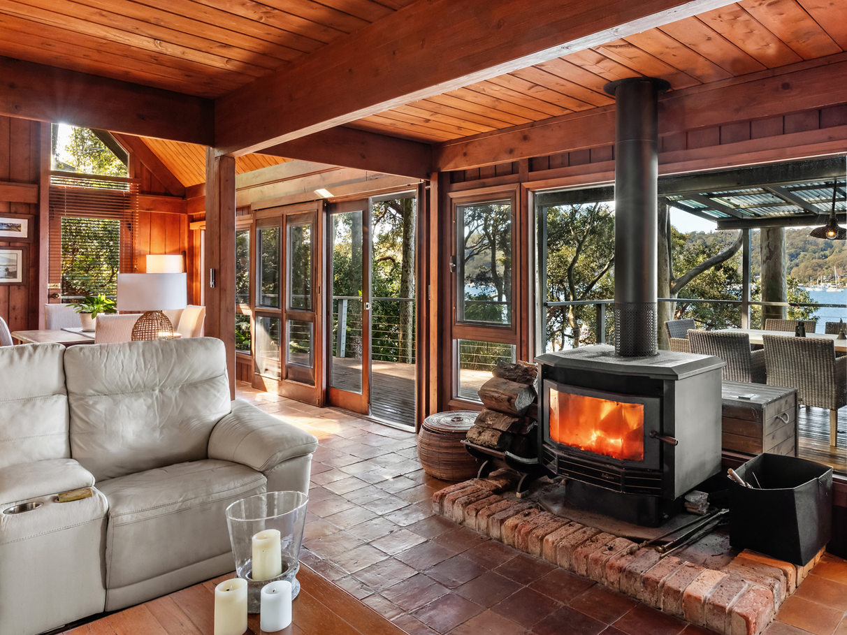 The main lounge, with its grand combustion fireplace, invites long winter evenings by the fire, while the country-style kitchen and dining space are made for convivial dinners with friends. Multiple decks frame sweeping views across Pittwater to Newport, ideal for long lunches or watching the ever-changing moods of the bay.