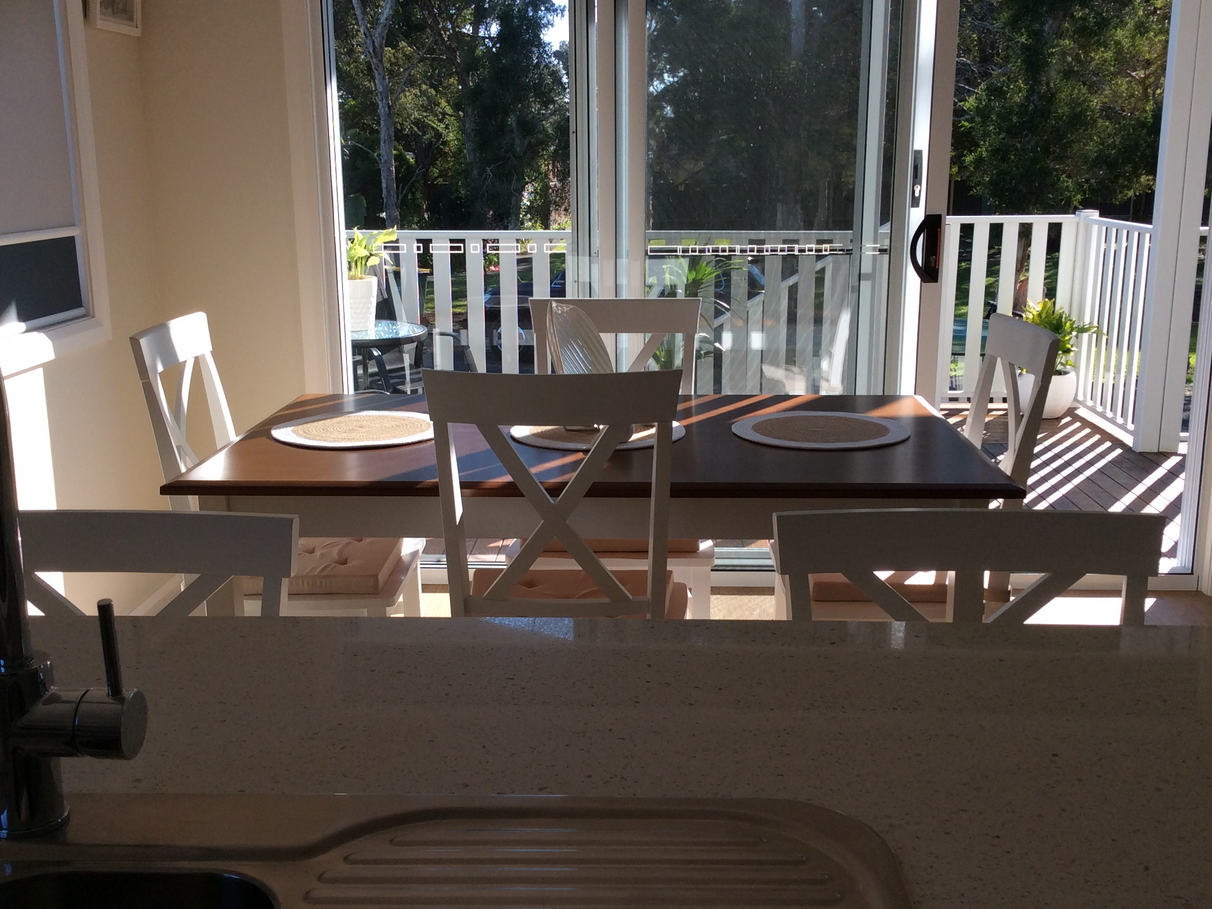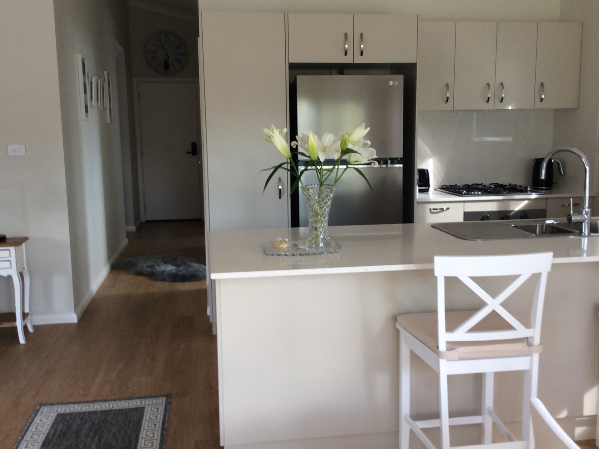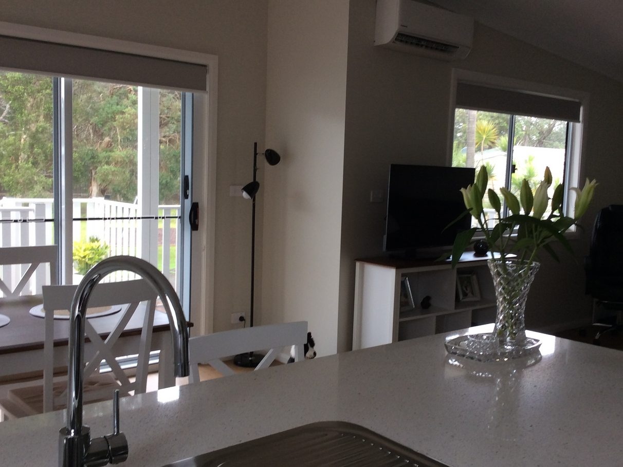This modern open plan living, kitchen and dining area home has high pitched ceilings, quality fittings, down lights, ceiling fans, stone bench tops, large windows and 3 panel sliding glass door which leads out to the sunny, north facing entertaining deck overlooking a lovely tree lined park.