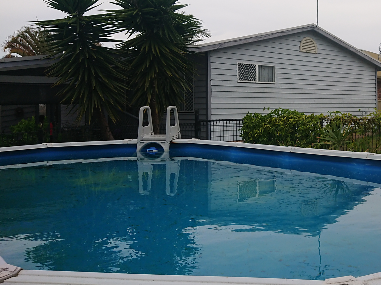 - Above-ground swimming pool with adjacent outdoor BBQ area & front deck.