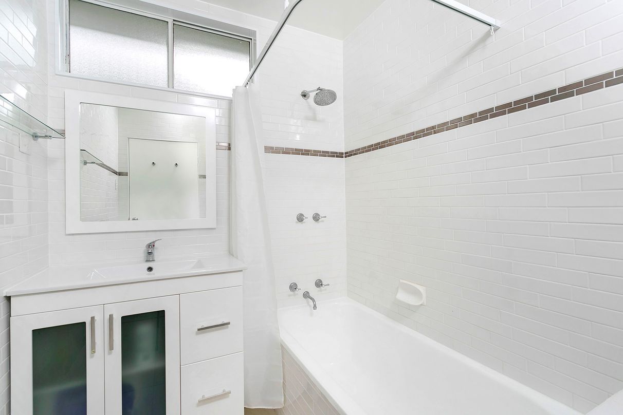 The classy family bathroom boasts floor to ceiling subway tiles and bath, facilitating 3 very large bedrooms.
