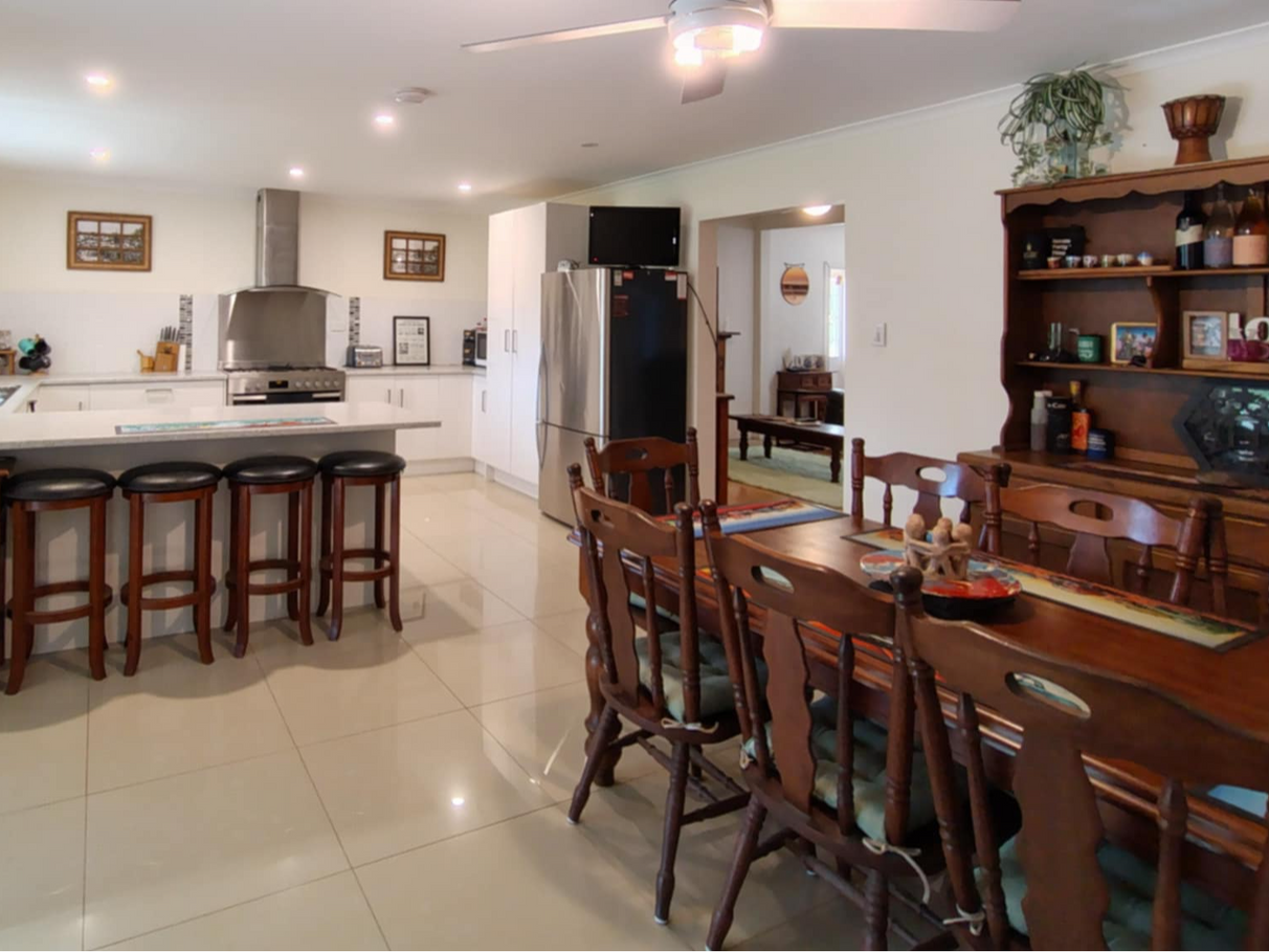 * Open plan kitchen/dining with large gas stove top and electric oven.
