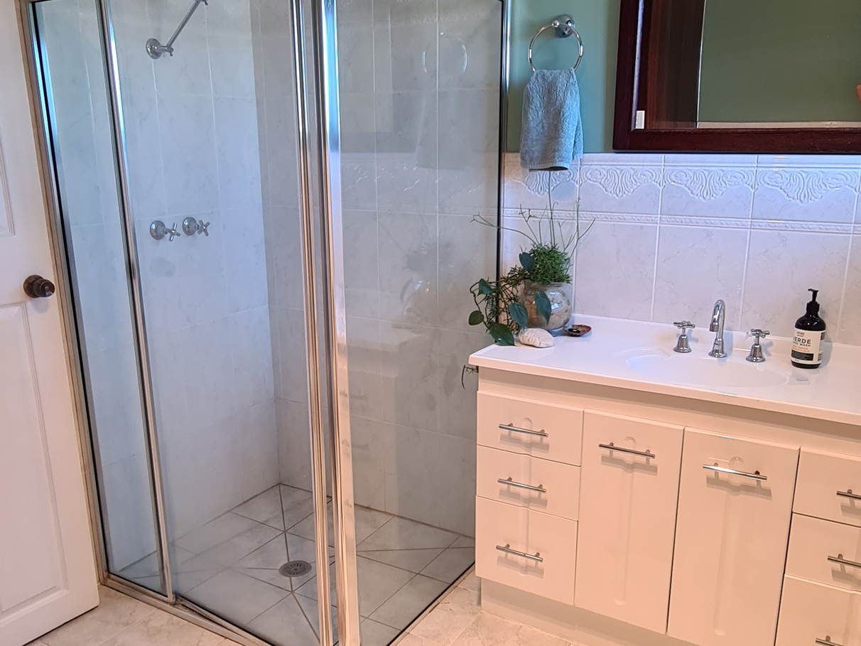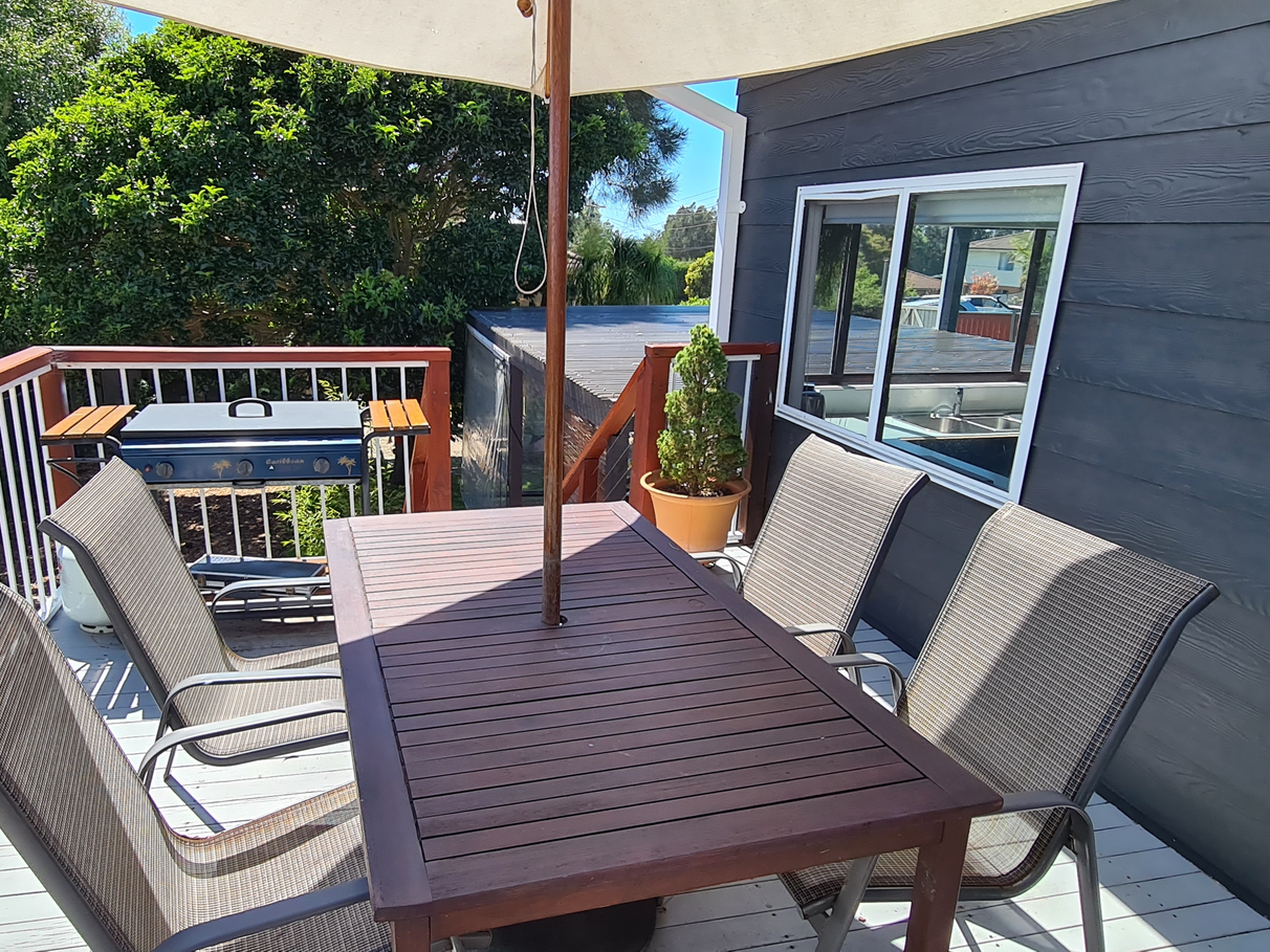 The house offers two outdoor living areas, one undercover with an outdoor bath and one with a view of the lake, perfect for a BBQ.