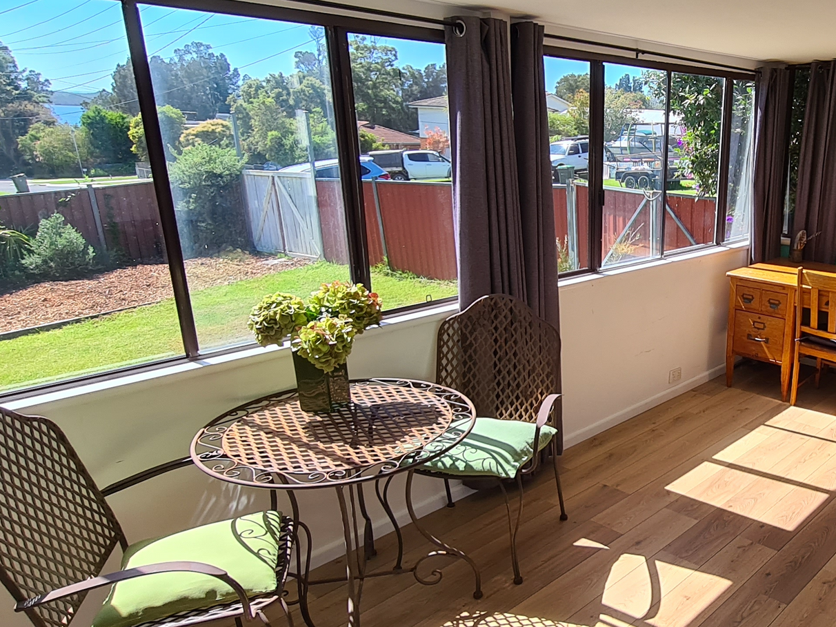 A sunroom at the rear of the house overlooks the backyard with excellent views of Coila lake.