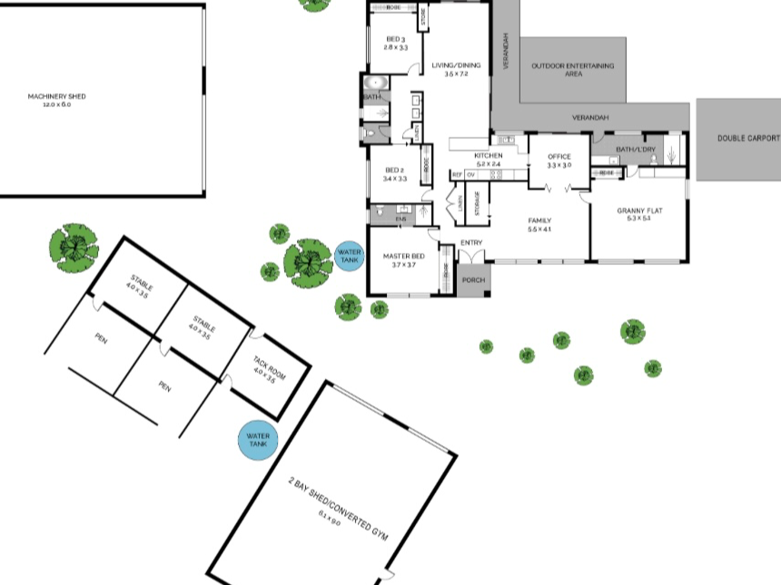 • Double garage approximately 9m x 12m, currently set up as a gym, with 5,000L water tank and pump