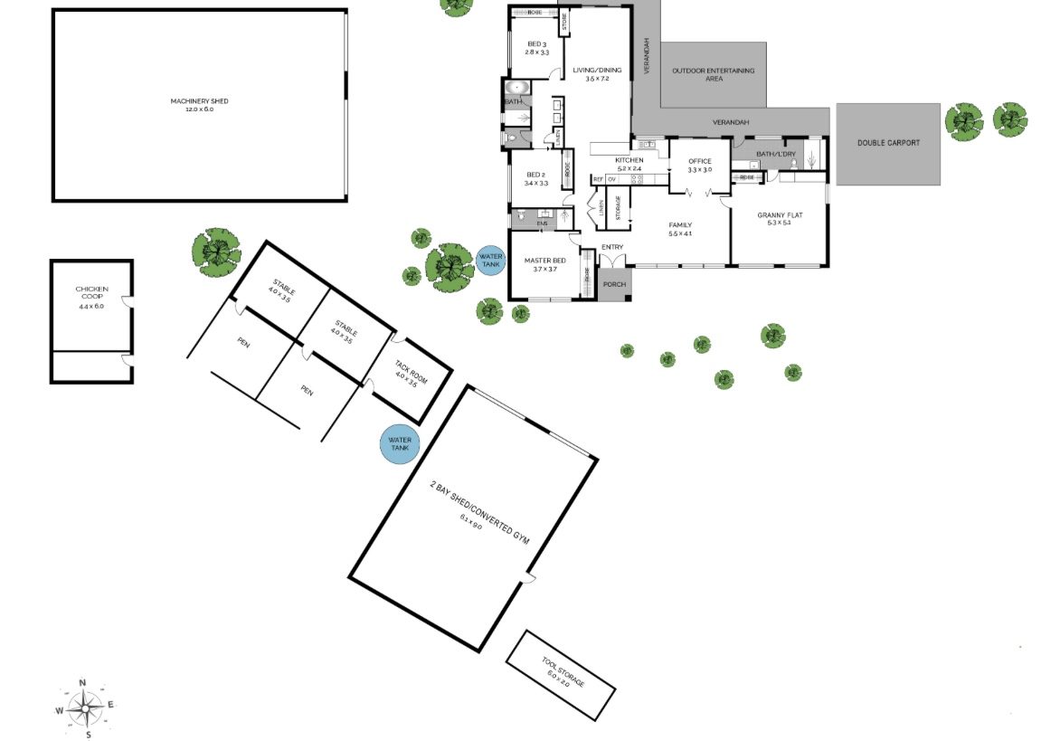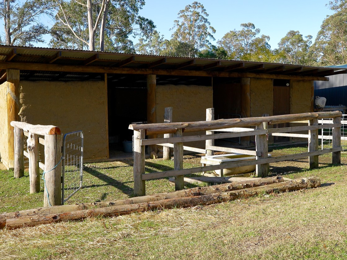 • Two-bay earth mud brick stables with indoor/outdoor access, tack room, custom feed boxes and 1,000L water tank