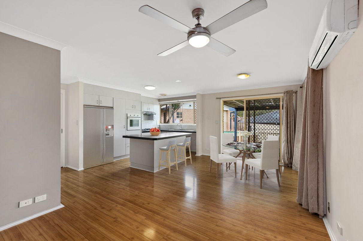 The kitchen and family rooms showcase beautiful timber laminate floors opening onto the large covered outdoor entertaining area overlooking the plunge pool.