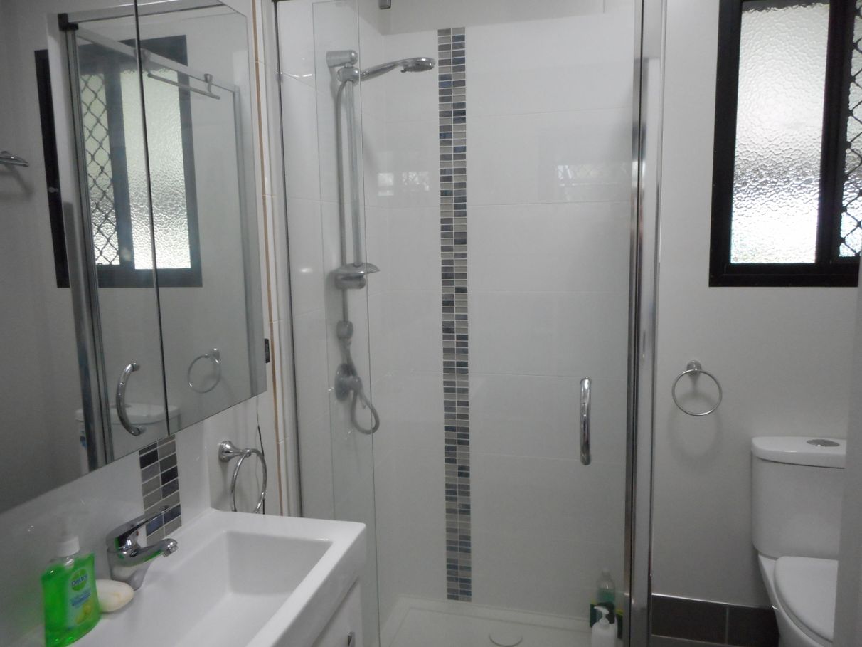 • Sparkling modern bathroom with laundry plumbing.