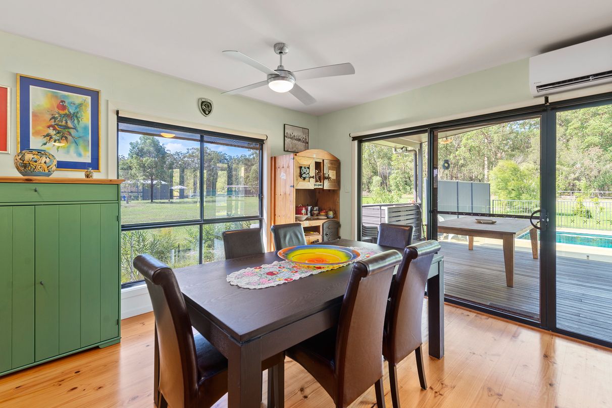 The discerning kitchen has been beautifully crafted with gorgeous stone benches, ample storage space, a gourmet oven and an island bench which doubles as a breakfast bar. Opening out into the light-filled dining area which sports air conditioning and floor length windows lapping up the picture-perfect views. Double doors open seamlessly out to the decked verandah, extending the living out to an impressive indoor/outdoor arena. Covered in for enjoyment all year round, it overlooks the sparkling swimming pool and distant bushlands. Outdoors, there are multiple places to relax including the landscaped fire pit entertaining area and expansive lawns surrounding the residence. The landscaped gardens are fully irrigated with timing pump leaving more time for you to sit back and enjoy the serenity. The expansive lounge area creates another space for the family to unwind.