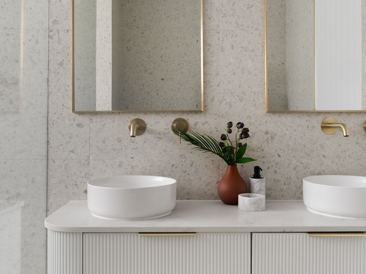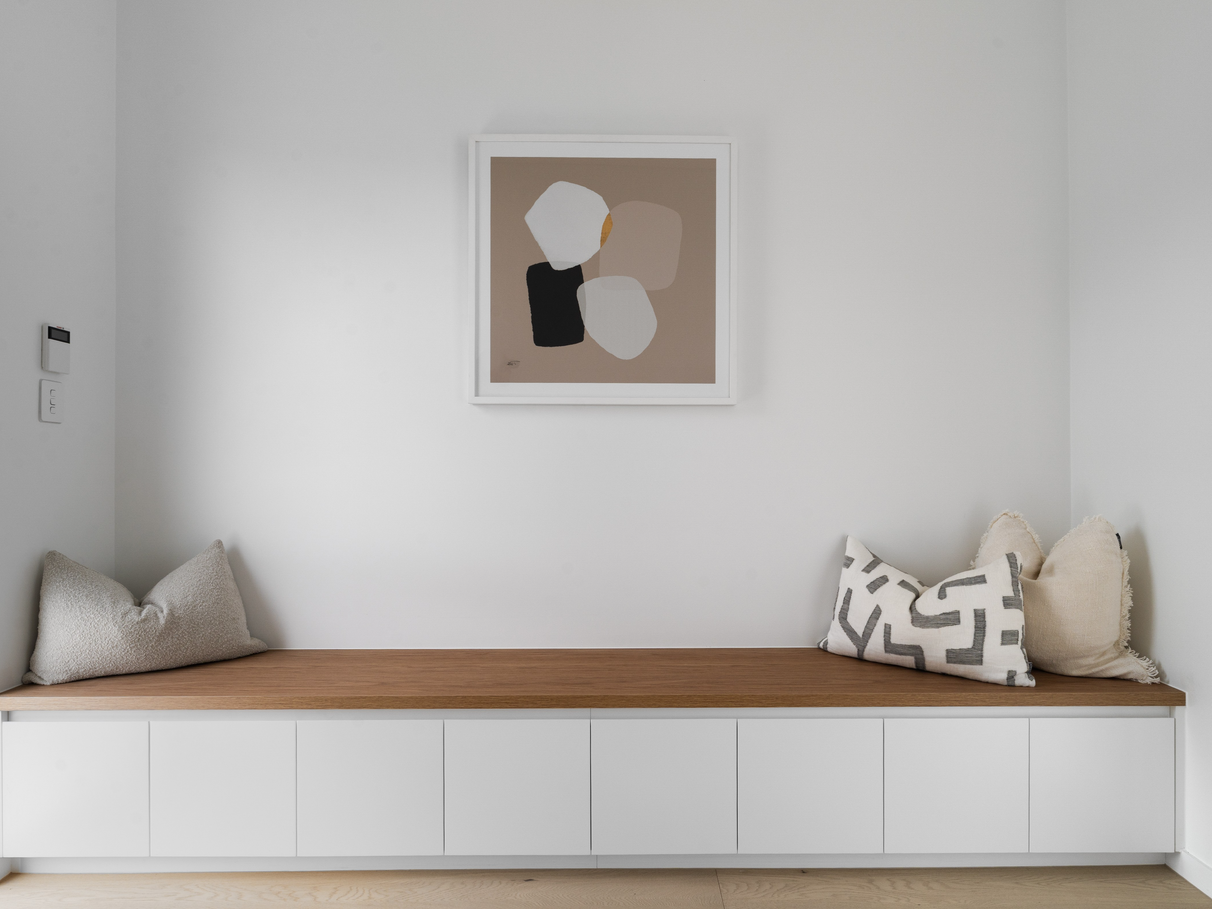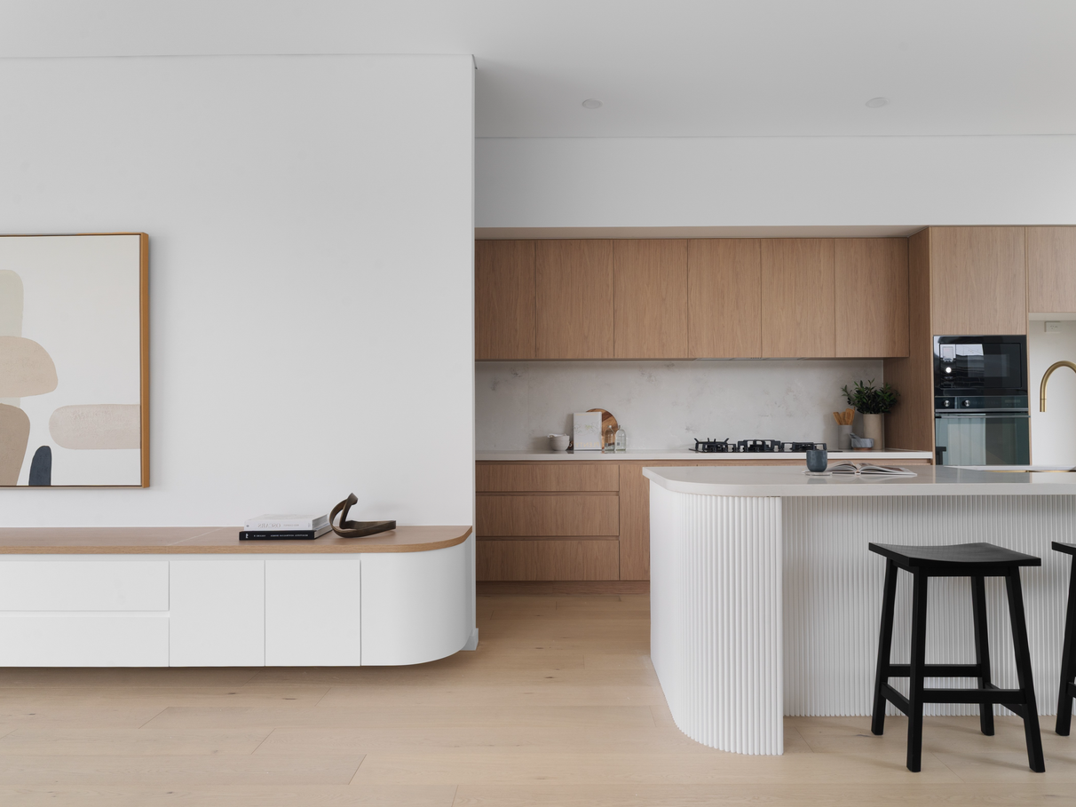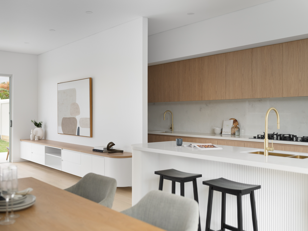 * Designer kitchen with 40mm Empira Caesarstone benches, 2-tone Polytech Steccawood and white polyurethane cabinetry