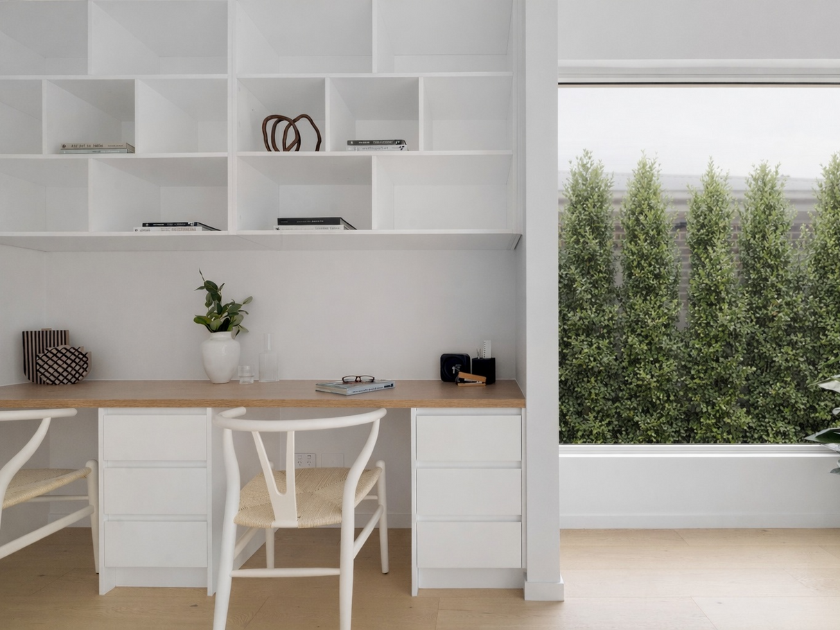 * Study/office with optimal visual connection to living spaces, while controlling noise