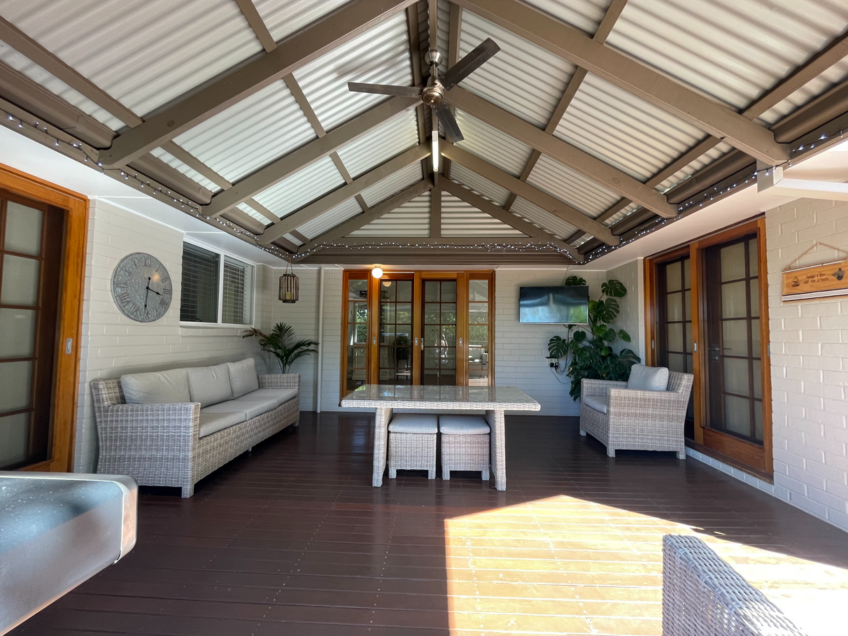 The alfresco dining is the ideal spot for year-round entertaining. Sheltered and covered by a high-pitched roof there is a ceiling fan, outdoor power, TV point and natural gas connections for cooking.