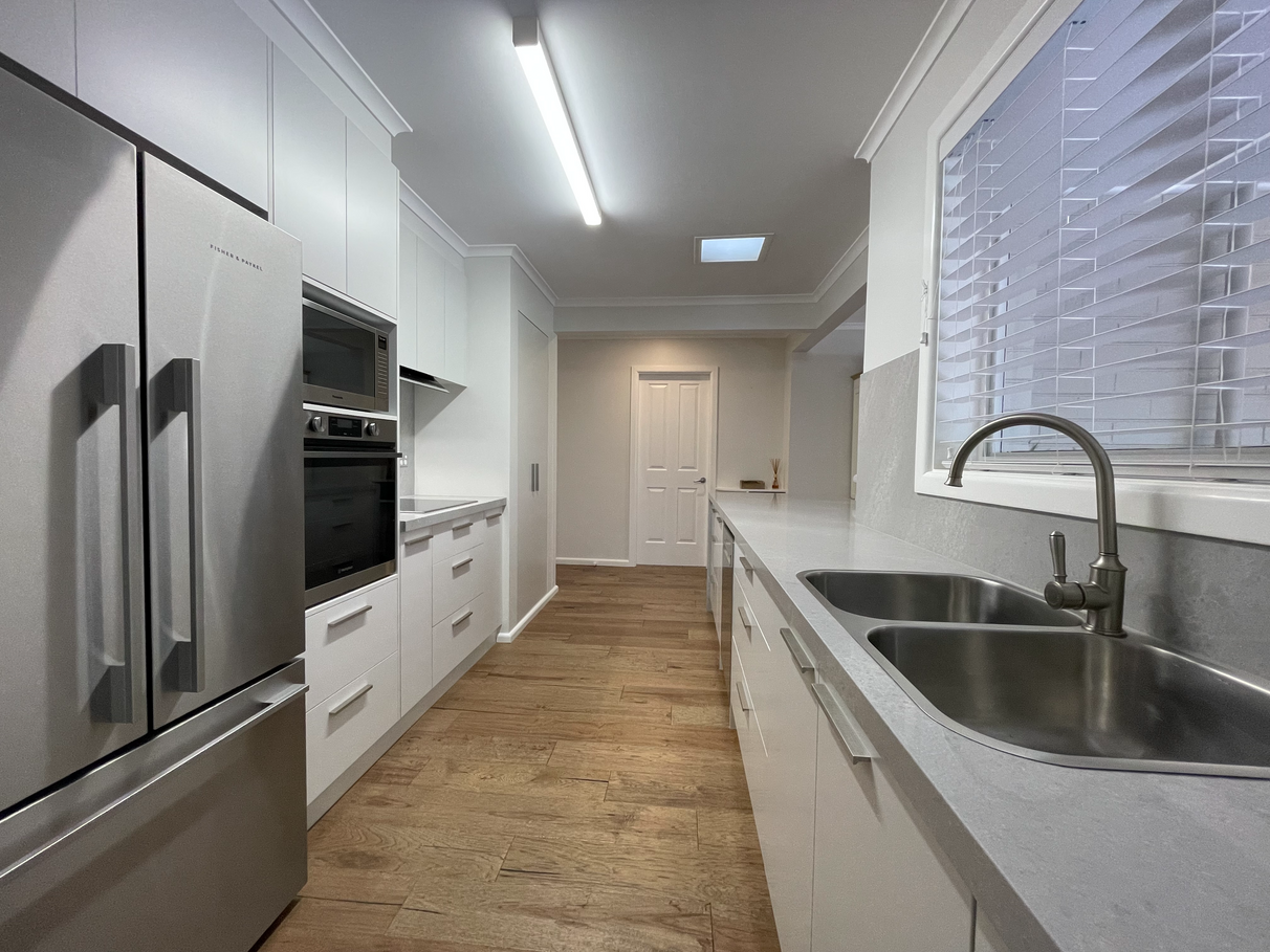 The central sleek galley style kitchen has been updated in neutral soft tones. Stone benchtops with waterfall edge to the floor and matching splashbacks. Premium appliances including Westinghouse oven, Bosch dishwasher, induction cooktop and concealed glass rangehood.