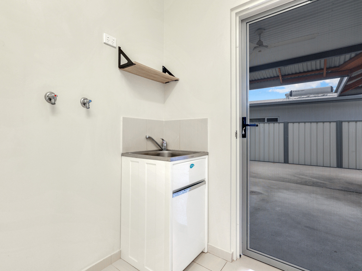Separate internal laundry room with cupboards with sliding door.