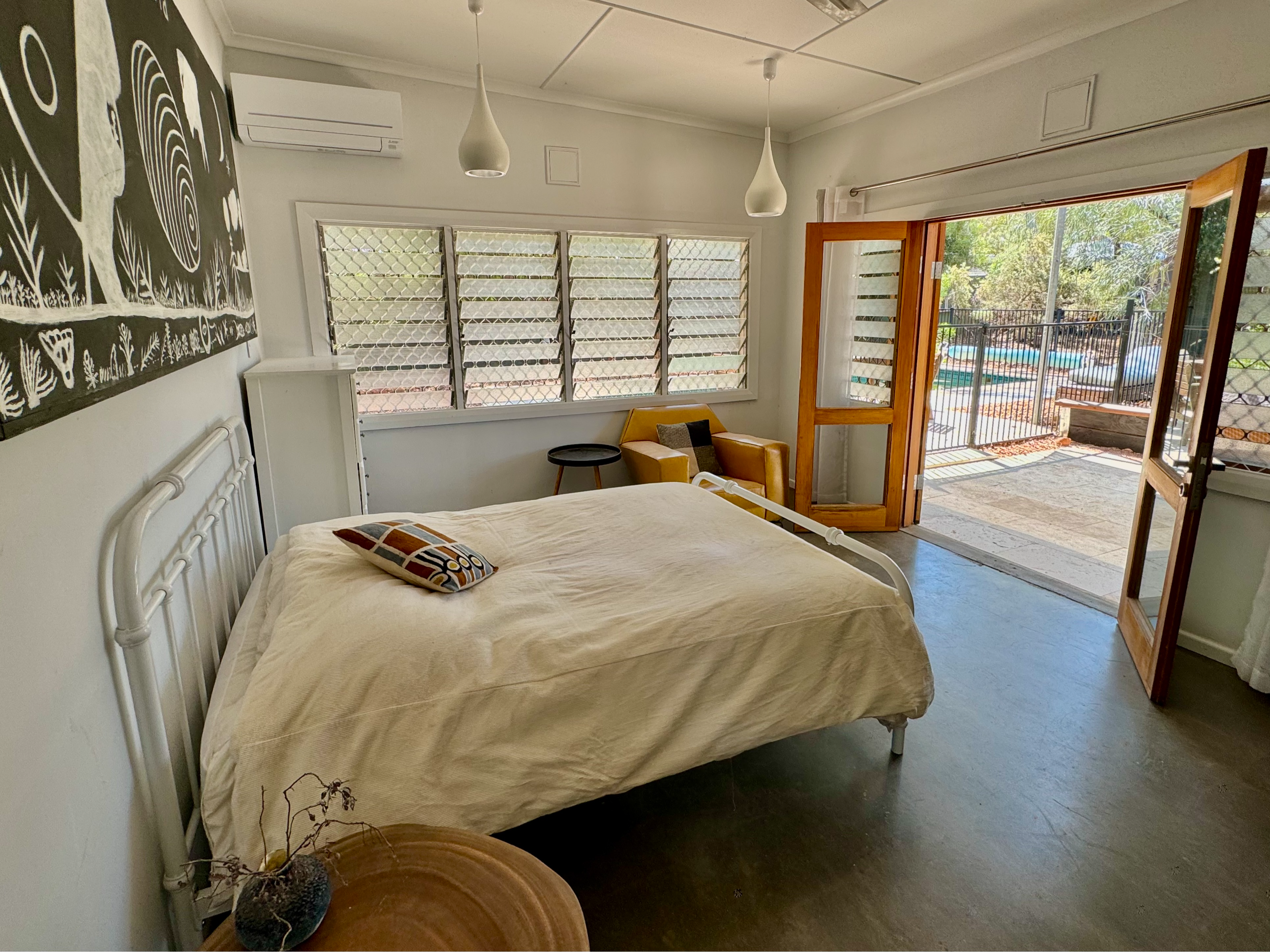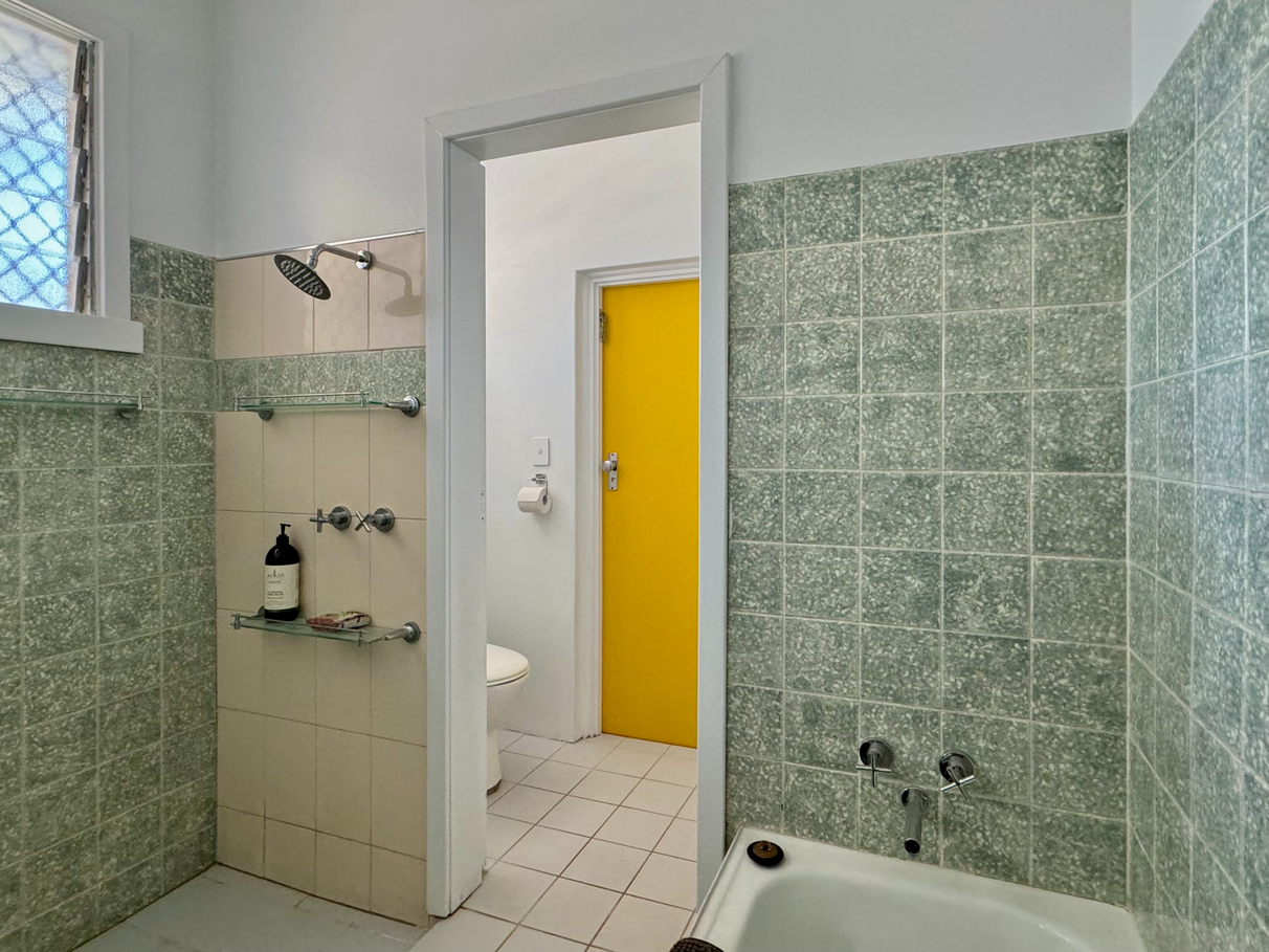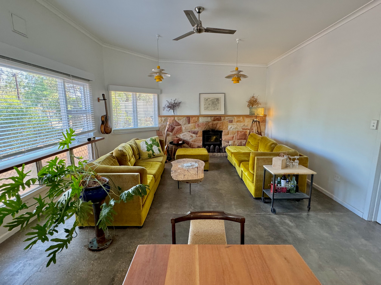 Spacious, light-filled living areas with a stunning sandstone fireplace and vintage Italian-tiled bathroom.