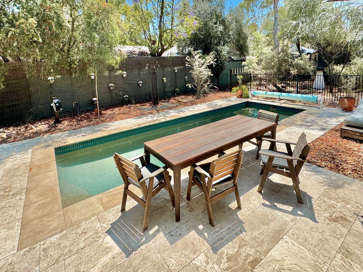 Low-maintenance pool with outdoor shower.