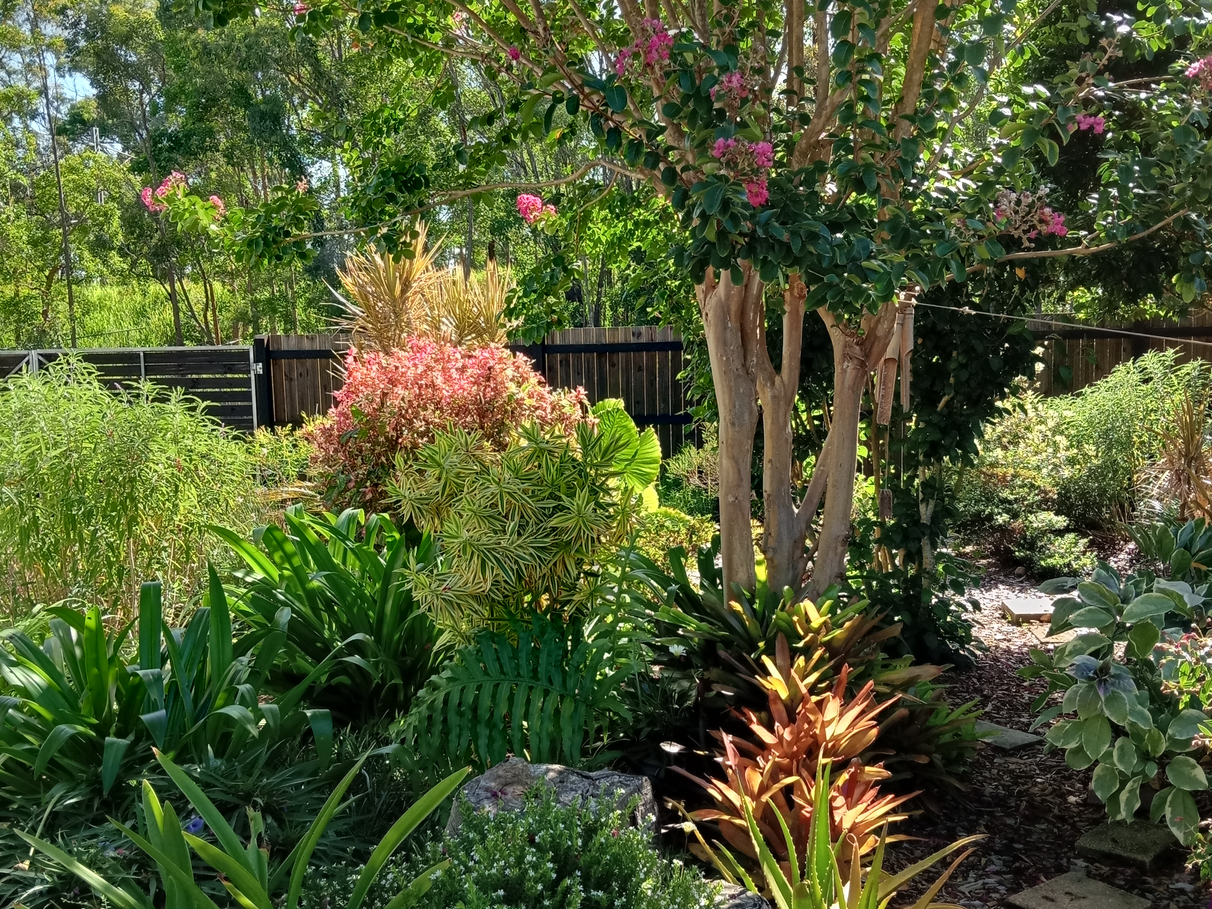 Native plantings and fruit trees in the garden. Peaceful and very picturesque.