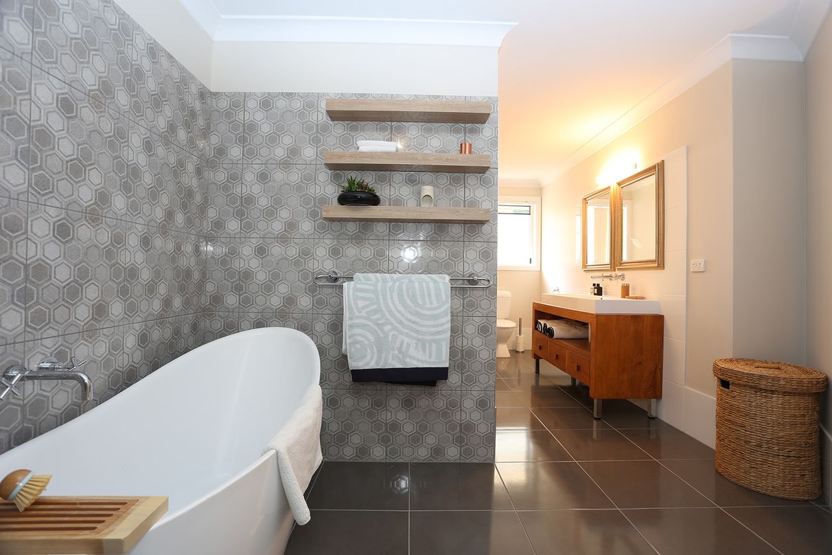 FIVE genuine bedrooms with large mirrored robes, the huge master with huge wall-to-wall mirrored robe and a gorgeous ensuite. And then there’s the sensational, designer family bathroom of a proportion you won’t believe! Making a bold statement with its unique design, encompassing a toilet and beautiful timber vanity basin, a huge corner shower and a luxurious freestanding bathtub!