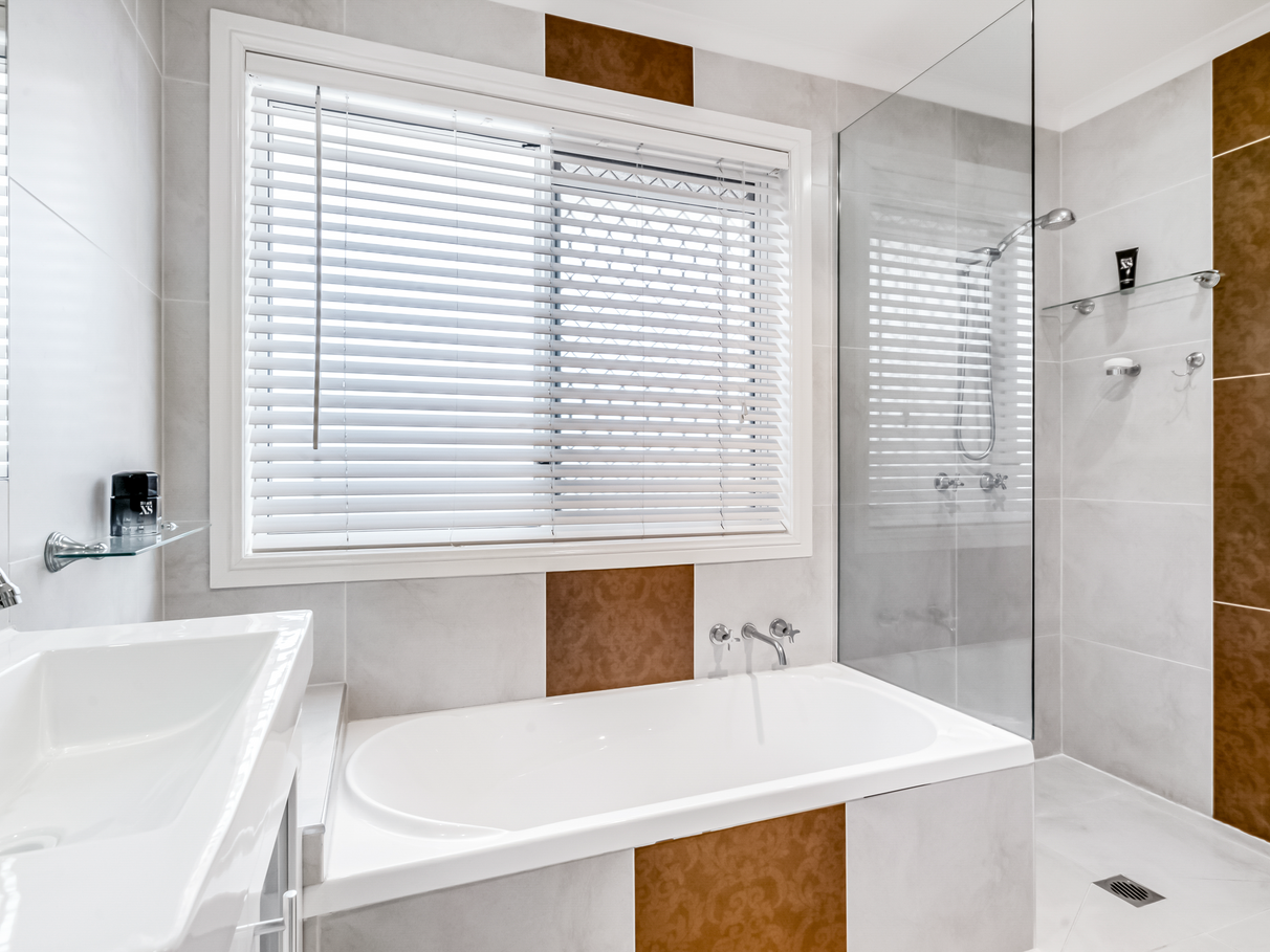• Wall to floor tiles in bathroom with separate bath and large shower