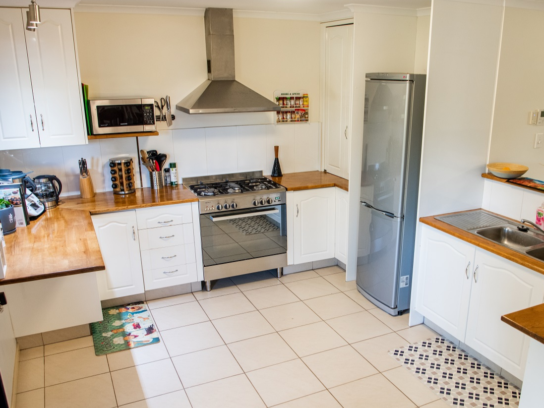 - Fabulous kitchen with Oak timber bench tops, big 900mm freestanding stainless steel gas oven with gas cooktop and rangehood.