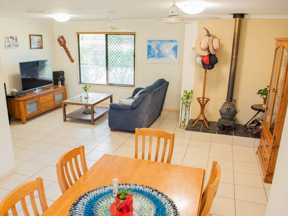 - Open plan, tiled living areas with a gorgeous pot belly fireplace.