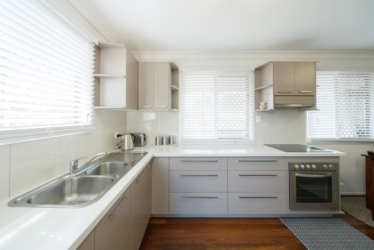 - Modern light-filled kitchen with ample cupboards and quality stainless steel oven and convection hot plates