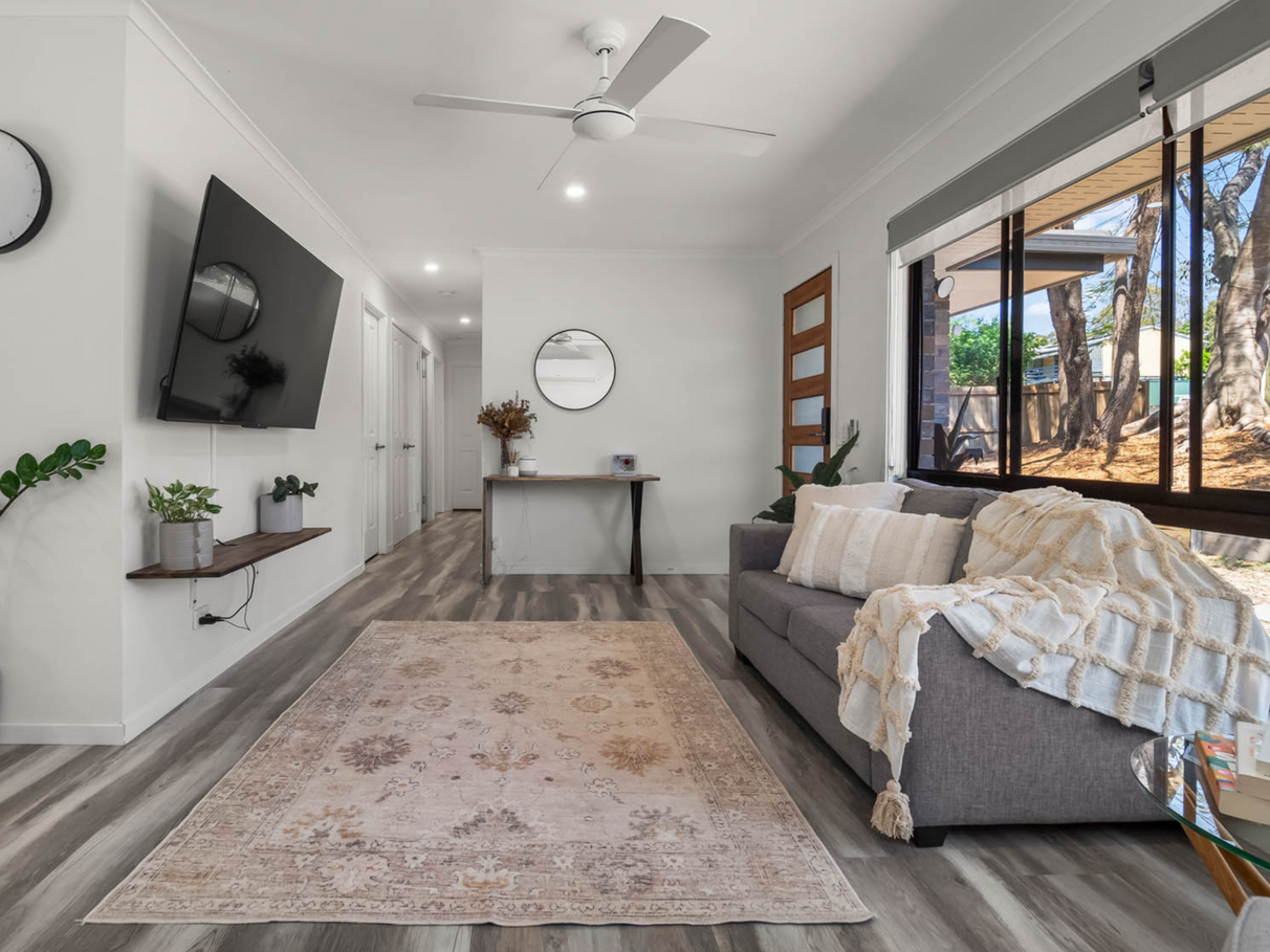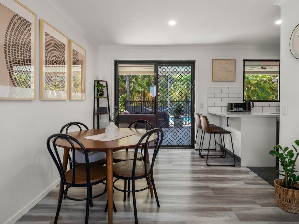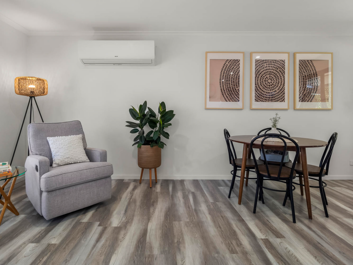 Spacious Family Layout: The air conditioned open-plan living and dining area boasts stylish hybrid flooring and abundant natural light, perfect for family game nights or cozy gatherings.