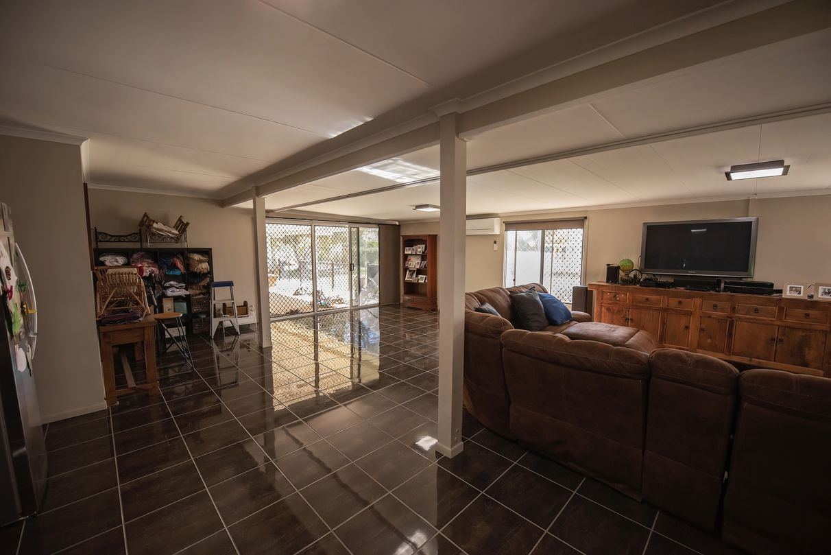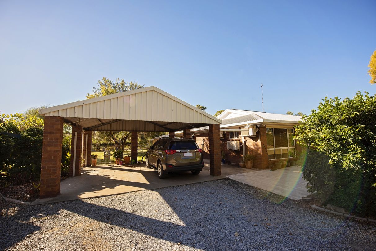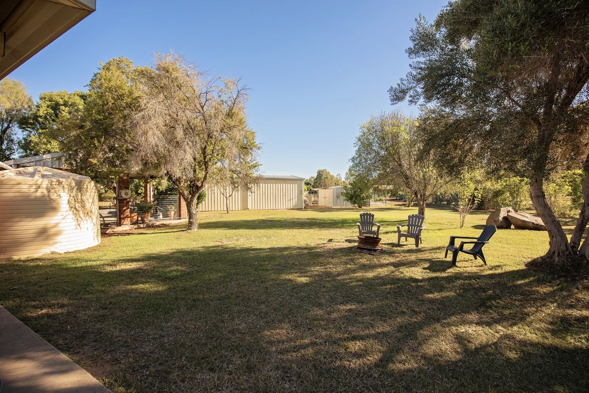 Two car carport off the house, 2 bay shed, garden shed, and a separate carport for the caravan/boat. 3 rainwater tanks.