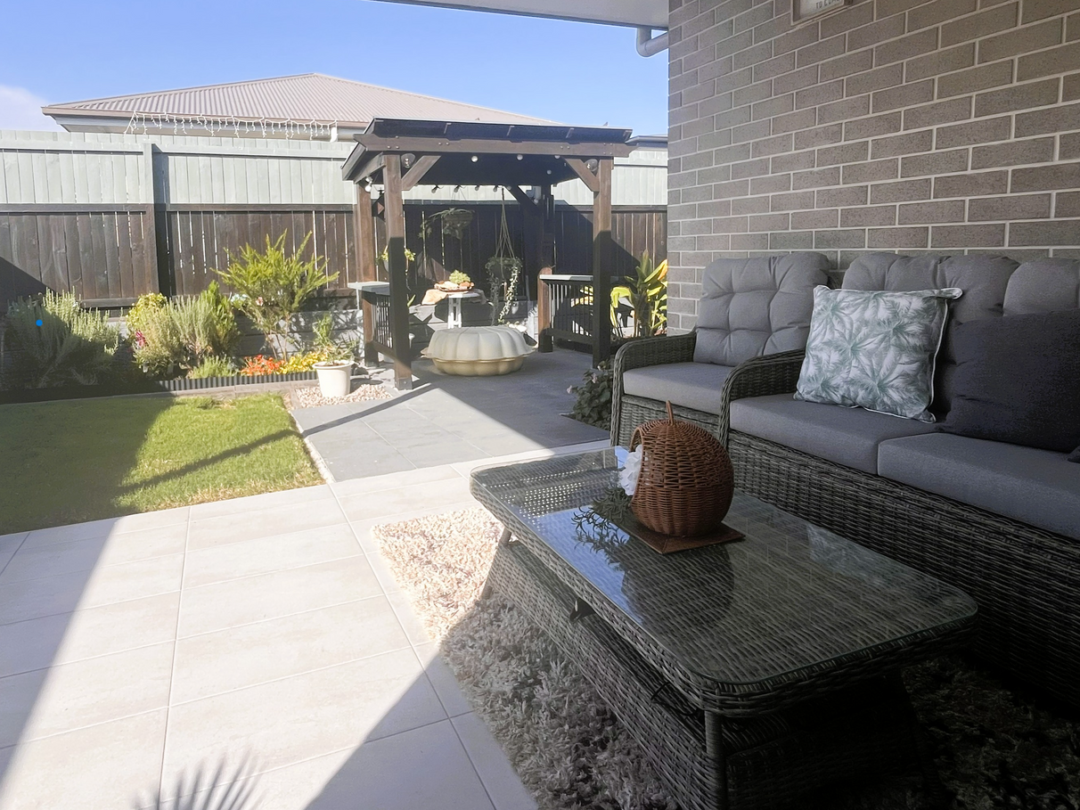 Private extended alfresco area with tiled flooring, cabana, and landscaped gardens