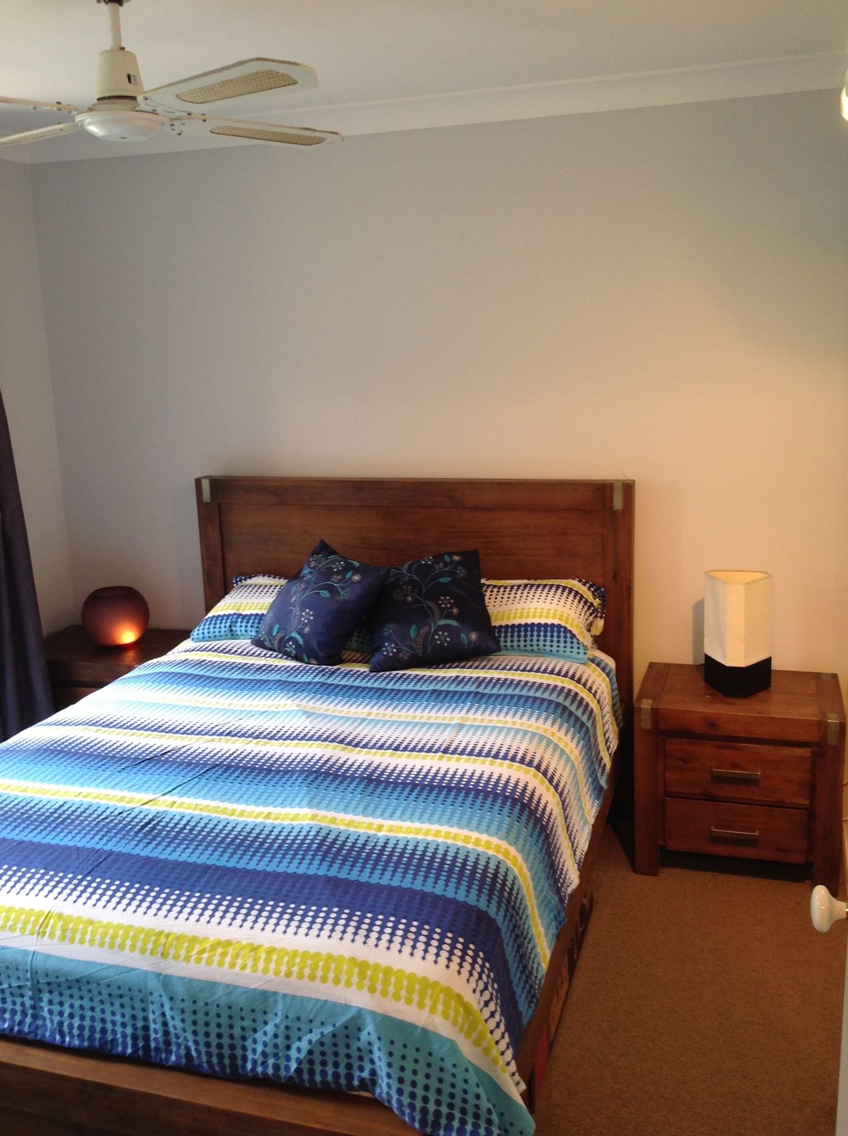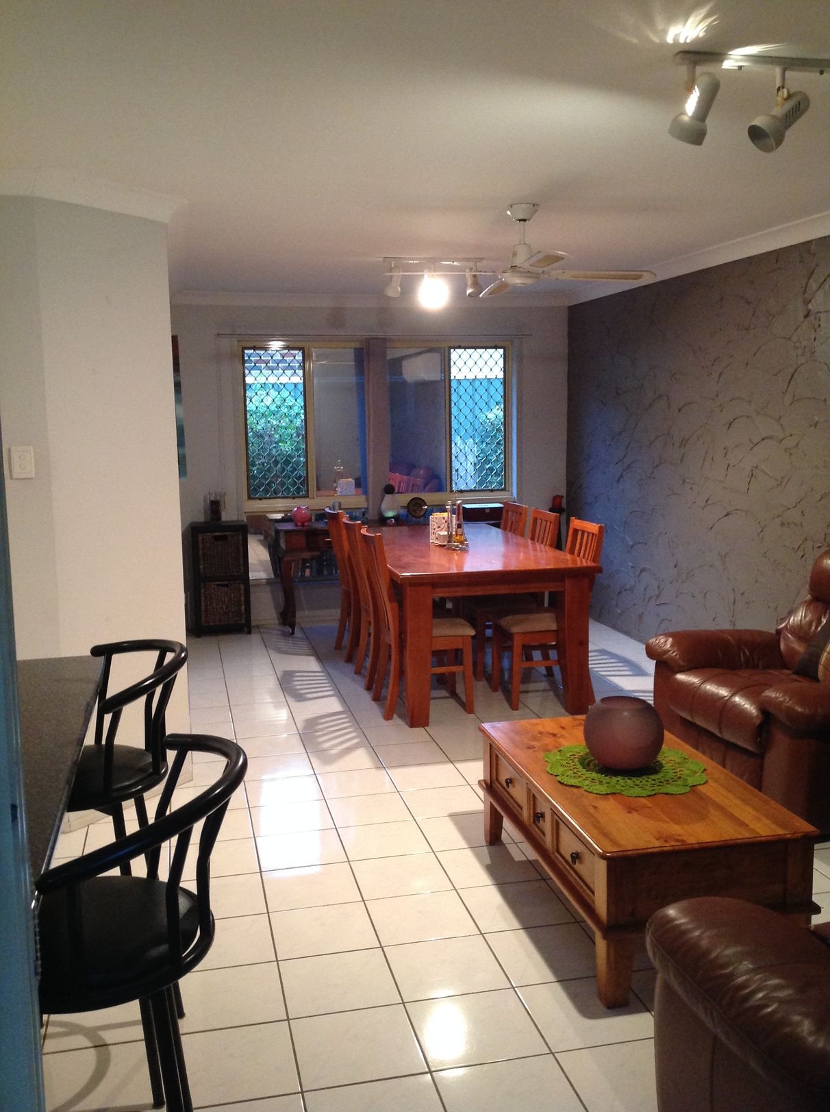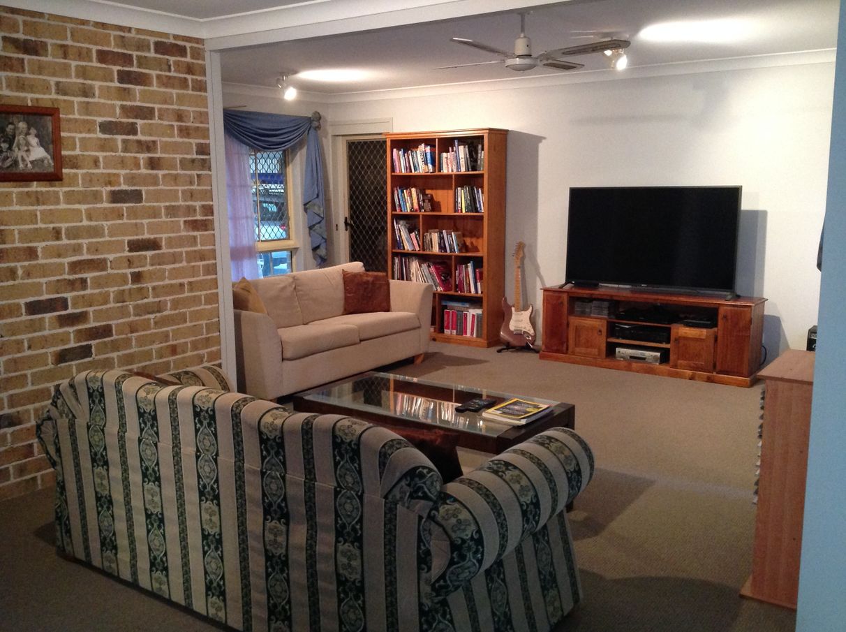 The first thing you’ll notice as you enter this well constructed brick and tile home is the very spacious lounge area (complete with feature brick wall). For maintaining a cool, comfortable environment in summer a ceiling fan and a massive (three year old) Fujitsu 9.2 kw air conditioner have been installed. NBN is connected for all your internet needs too. Continuing on across the modern white tiled floors you come to a spacious and well equiped kitchen (complete with dishwasher, double sink, four burner gas stove and oven, and more than ample storage space). Your endless supply of hot water comes from the LPG gas water heater. An ‘island’ food preparation bench provides easy, comfortable and practical access to stove, fridge, sinks, pantry, etc. A breakfast bar separates the open plan kitchen from the spacious dining/living area. Chat with friends while you put the finishing touches to the Thai Basil Chicken.