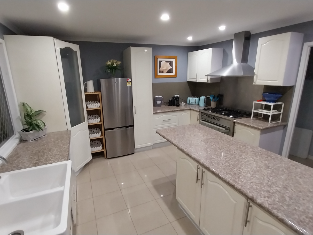 A roomy kitchen with plenty of cupboard and bench space and a huge 90cm gas stove is at the heart of the home. It also features a farmhouse sink.