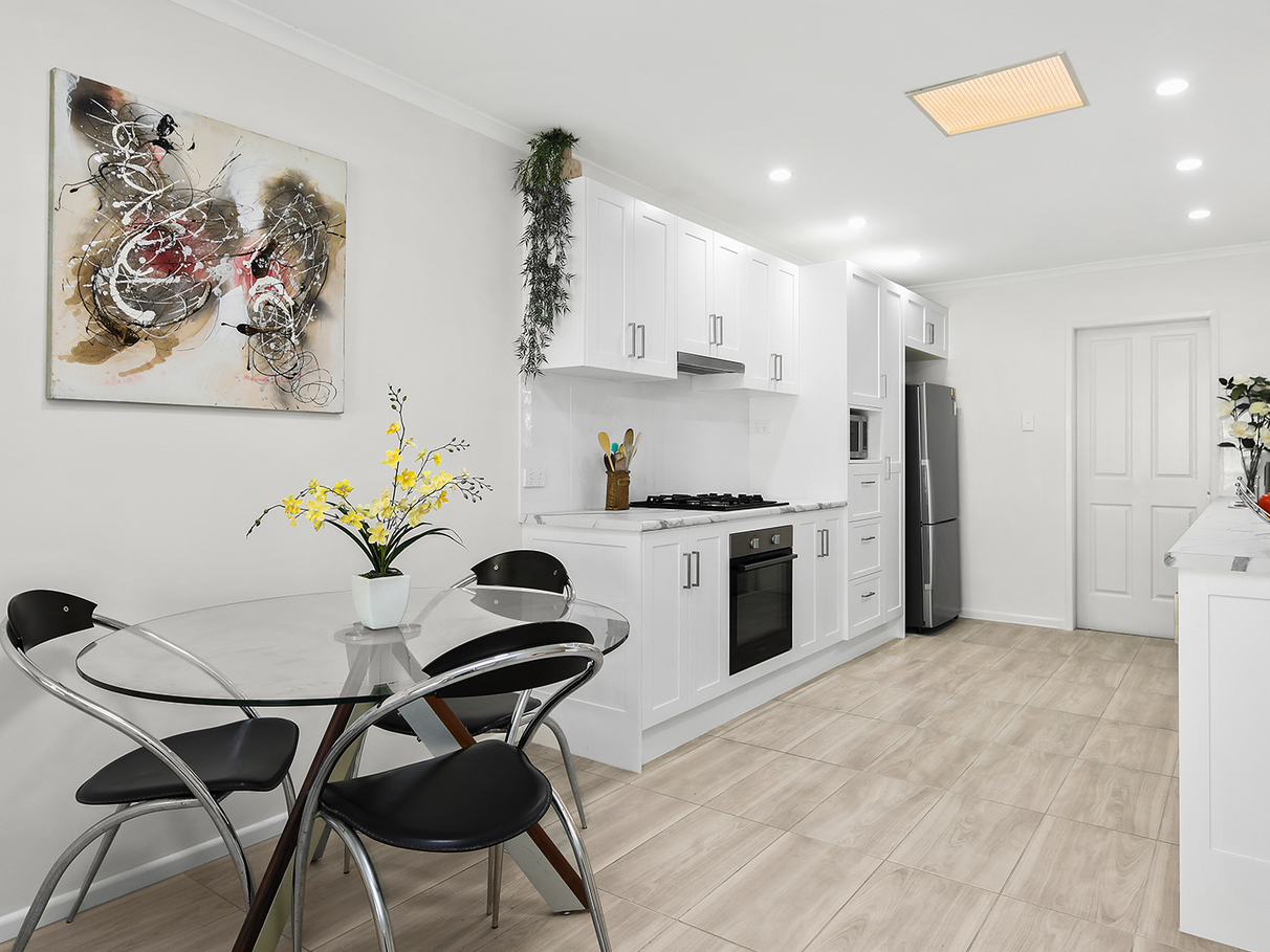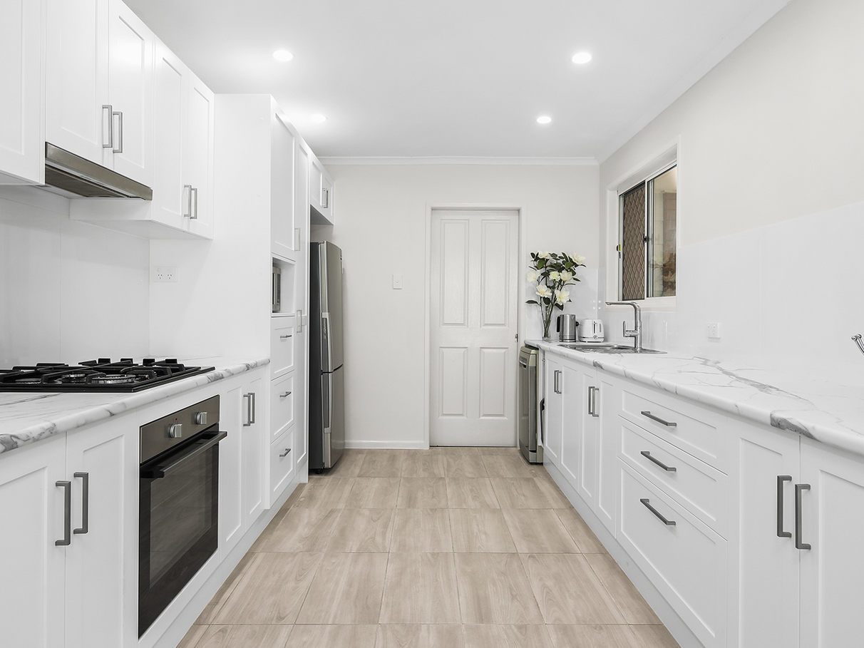 The galley style kitchen has shaker doors and the pantry has 5 pull-out, enclosed shelves for very easy access as well as 3 normal shelves. Ample bench space and storage.