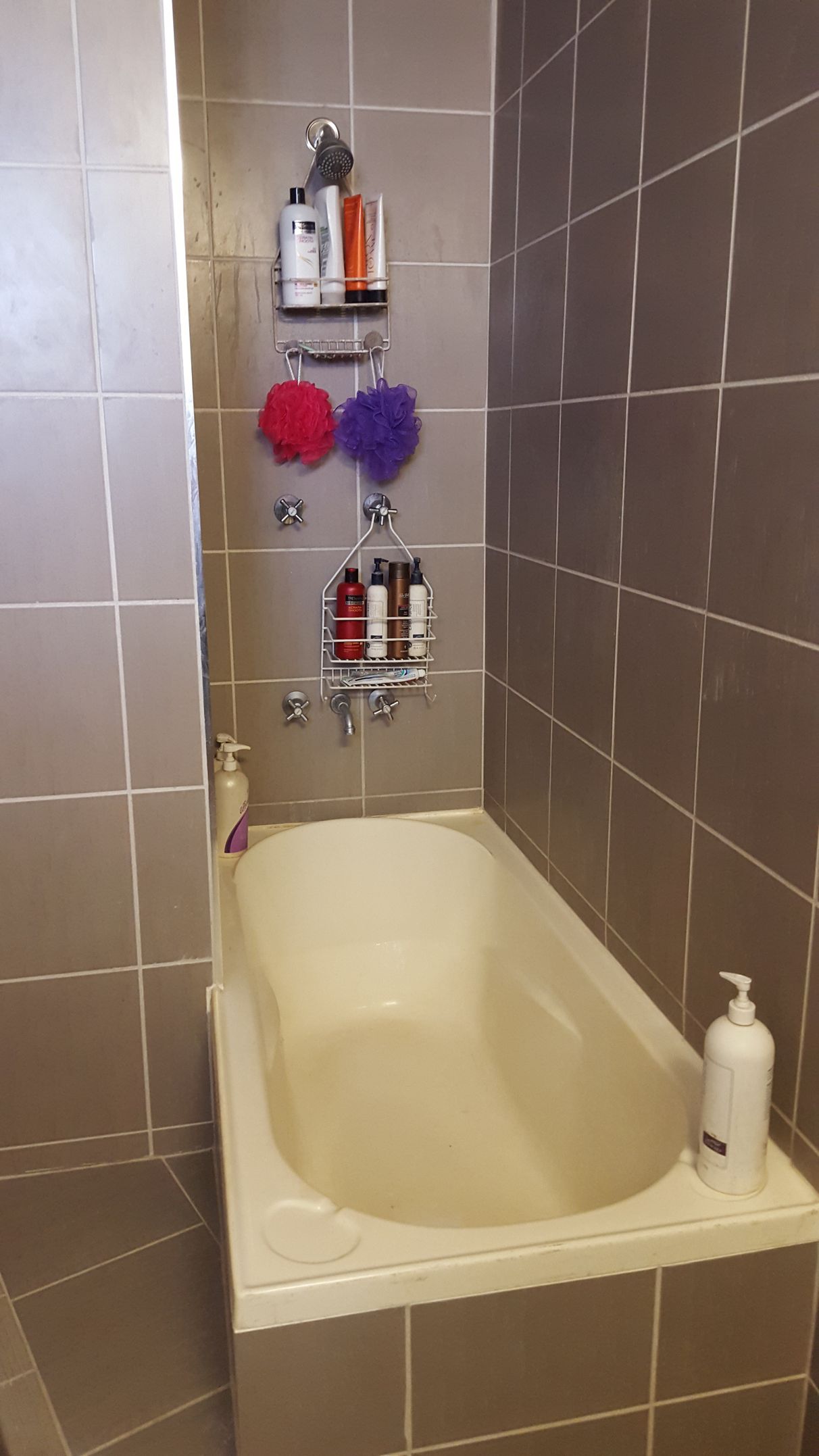 - Modern tiled bathroom with a combined shower/bath