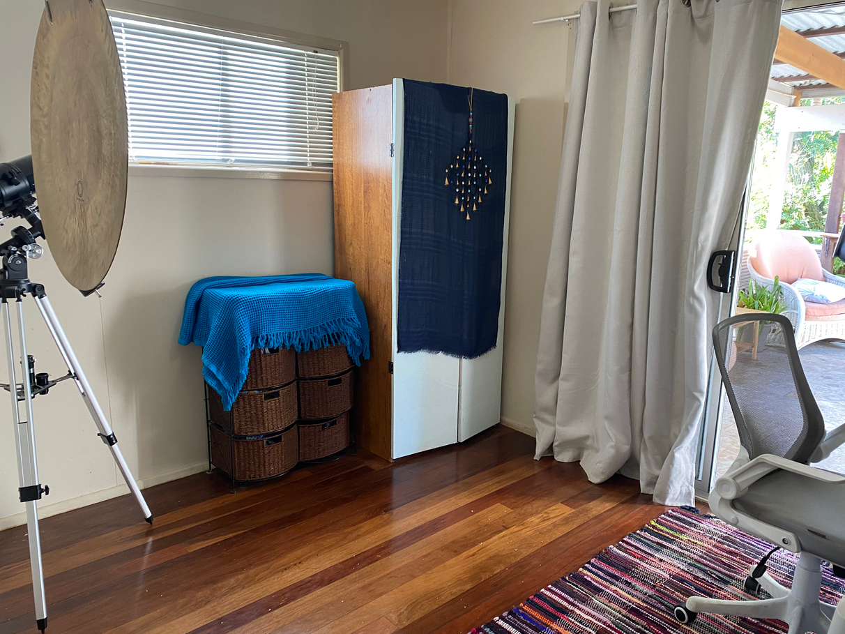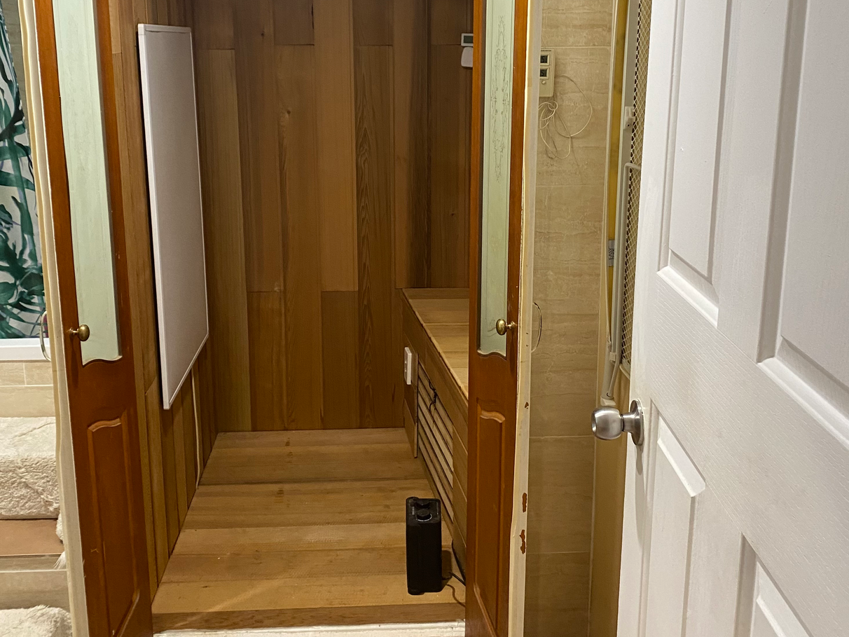 Level 1 downstairs is perfect for the teenage retreat space, with day bed, media room, and bathroom/toilet/bath/shower/sauna. Office and kitchenette overlook leafy backyard haven.