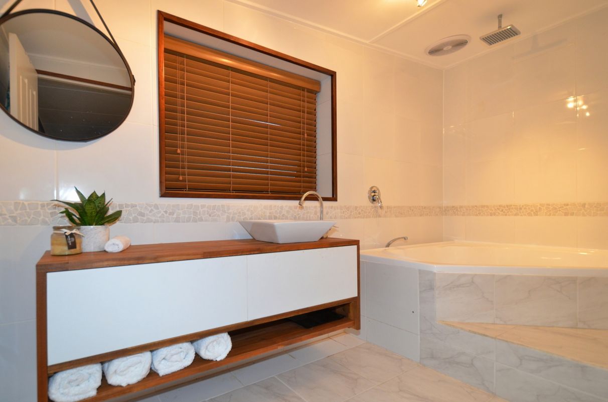It doesn’t stop there; the home has a large open plan living room with pool table that transitions via fully extendable bi-fold doors to a covered rear patio overlooking the lush tropical gardens. There are 3 generous bedrooms, one with a built in ‘Murphy Bed’ to maximise on space and have a dual-purpose bedroom/office. The master bedroom has ample storage with a luxurious double door walk in wardrobe. The stylishly renovated bathroom is fully tiled with an on-trend marble and stone inspired combination. The bathroom has a full corner bath with rain head shower and Nordic style wall hung vanity. The second shower is perfectly positioned for use as an outdoor shower that services both the house and pool area.