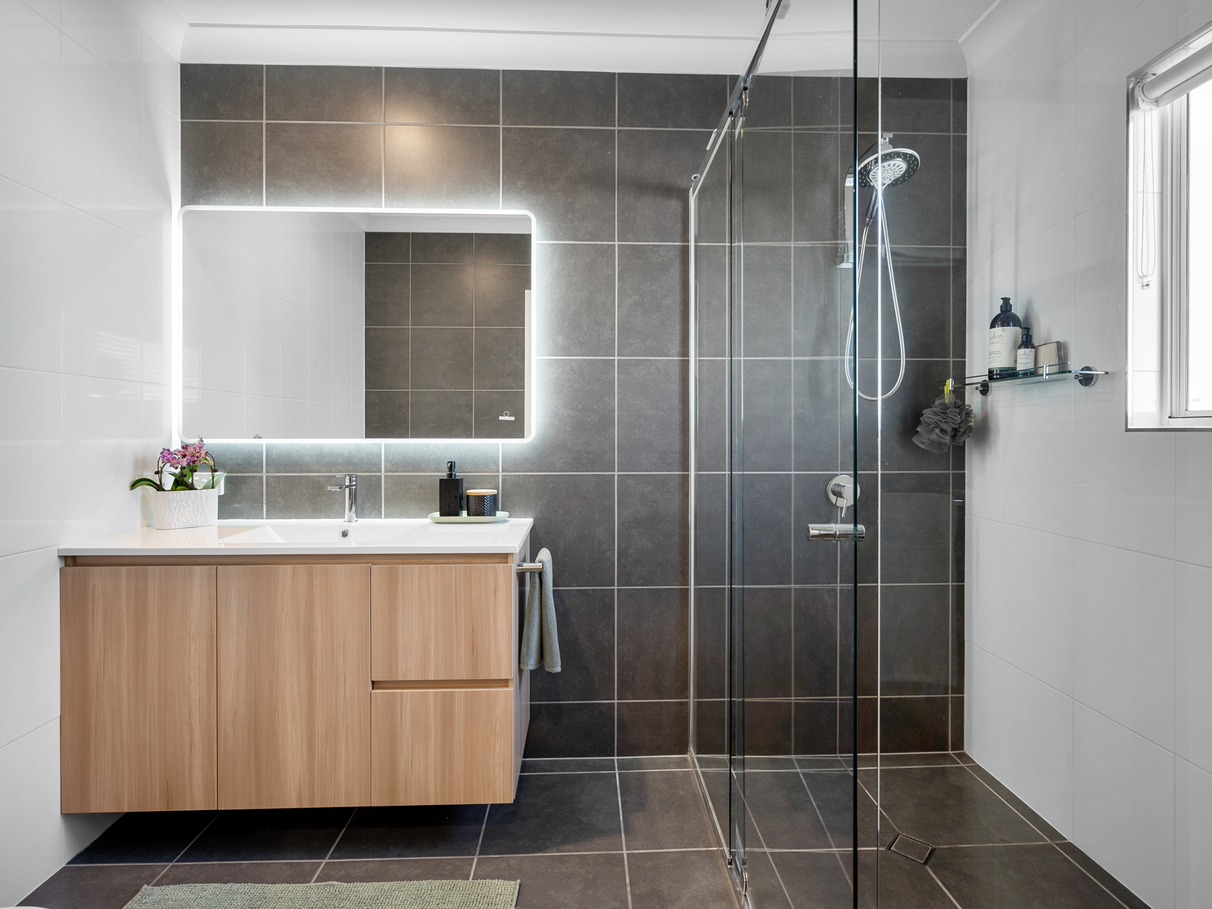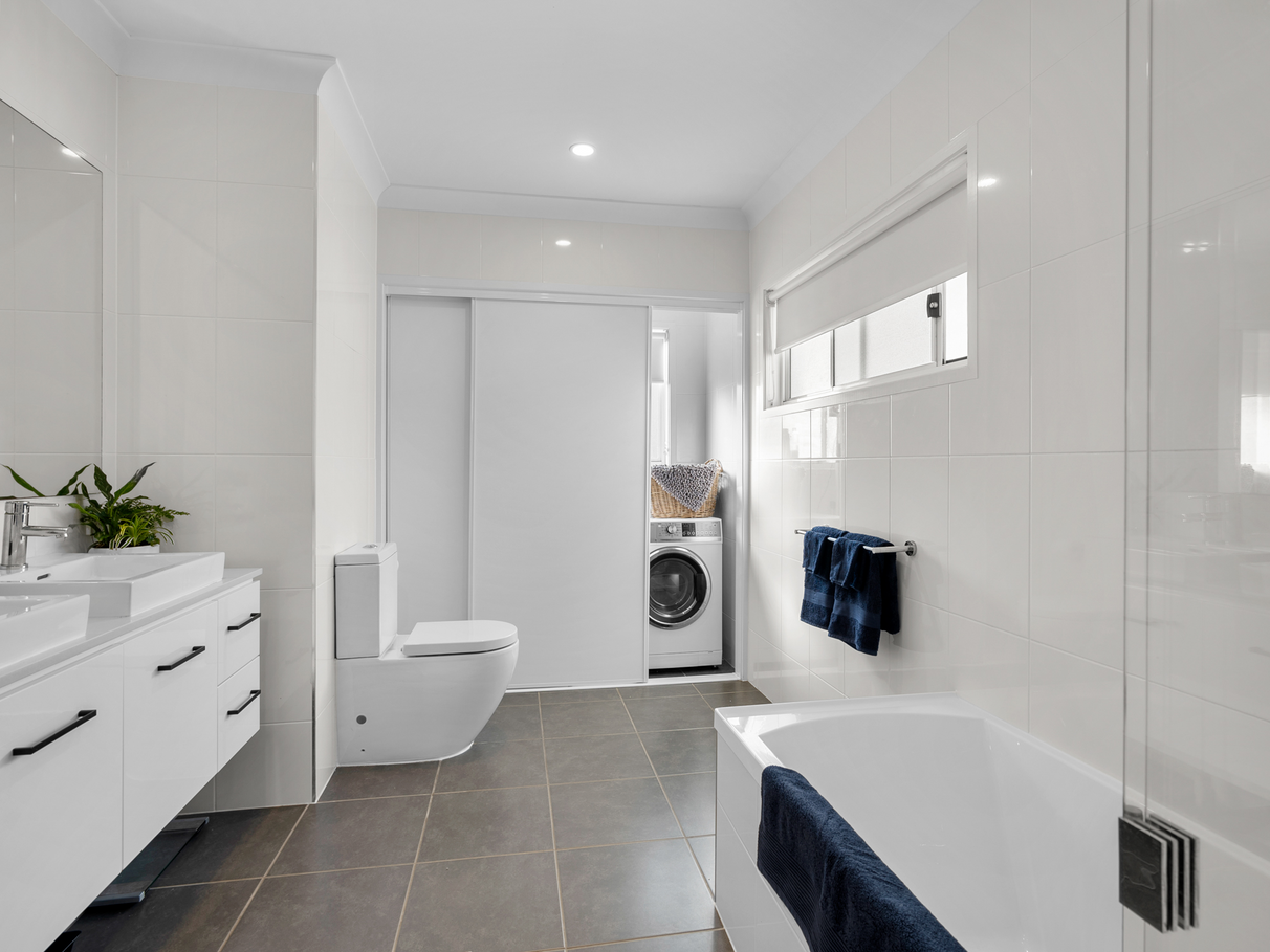 • Stylish Main Bathroom: Featuring his-and-her sinks, shower over bath and a well-appointed concealed laundry for ease and convenience.