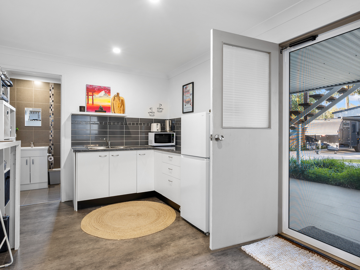 • Open Living & Dining: Generously sized and air-conditioned, with a kitchenette, ample storage and 2 ceiling fans makes this a fully functional area.